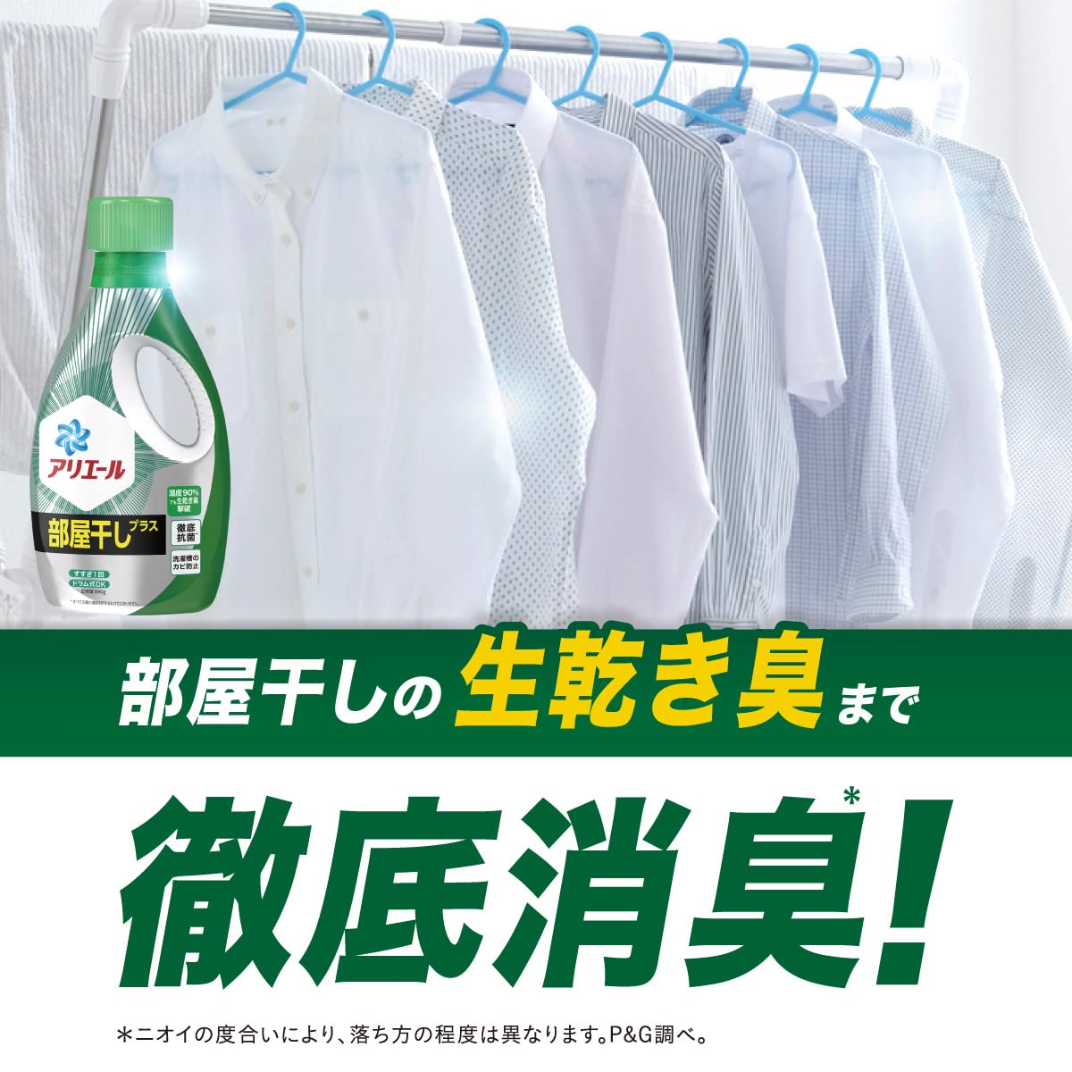 [大容量] アリエール ジェル 洗濯洗剤 液体 部屋干しプラス 詰め替え 2,240g。 商品紹介 煮沸レベルの部屋干し超消臭生乾き消臭成分2倍 * * アリエールジェル対比レノア超消臭共同開発売上No.1! *1 部屋干し用洗剤 *1 インテージSRI+ 濃縮洗剤市場ブランド金額シェア データ期間:2017年1月~2020年12月 全国業態計煮沸レベルの部屋干し超消臭! 洗い直しゼロへ *2 *2 P&G調べ。 ニオイの度合いにより、落ち方の程度は異なります。 洗濯槽のカビ防止タオルのニオイ癖や生乾き臭も徹底消臭 洗濯槽クリーナーなしでも洗濯槽のカビ防止 洗濯洗剤 アリエール 部屋干しプラス 煮沸レベルの超消臭 原材料・成分 界面活性剤(26%:ポリオキシエチレンアルキルエーテル、直鎖アルキルベンゼンスルホン酸塩、純せっけん分(脂肪酸塩))、安定化剤、アルカリ剤、分散剤、水軟化剤、蛍光増白剤、酵素。 煮沸レベル*1の部屋干し超消臭! 5年ぶりの大改良、アリエール部屋干しプラス!。 消臭成分2倍*2で、煮沸レベルの消臭力*1! タオルのニオイ癖や生乾き臭も徹底消臭*1。 しかも徹底抗菌*3!。 そして洗濯槽クリーナーなしでも洗濯槽のカビ防止!。 *1 P&G調べ((綿100%試験布における実験において)水にて洗濯後5分間煮沸した布と、アリエール部屋干しプラスにて洗濯した布において、消臭効果を検証)。 ニオイの度合いにより落ち方の程度は異なります *2 アリエールジェル対比 *3 全ての菌の増殖を抑えるわけではありません。 S000-K9999