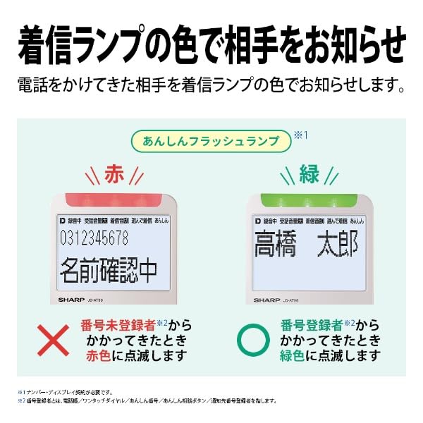 シャープ 電話機 コードレス 振り込め詐欺対策機能搭載 電話機単体 ゴールド系 JD-AT96C。 親機の受話器もコードレスだから、話しながら部屋を移動したり、そのまま手渡して取り次げます。 コードレス子機と同じような使い方ができます。 大きくて見やすい「漢字液晶」。 あやしい電話からしっかりガードする「防犯機能」が設定済み。 着信音が鳴る前に警告するので、気づかないうちに迷惑電話を撃退できます。 また警告されても電話を切らない相手には、名前を確認する自動メッセージを流すので、相手を確認してから電話に出るか判断できます。 シャープの電話機なら、2重の対策で迷惑電話をしっかり防ぎます。 電話をかけてきた相手を着信ランプの色でお知らせします。 本体メモリーに、たっぷり120分(1件10分まで、最大100件)録音できます。 もしメモリーがいっぱいになっても、古い録音から自動的に上書きされるので、録音できなくなることはありません。 着信中や通話中、留守応答中でもボタンを押すだけで、メッセージを流し、電話を切ります。 スピーカーを通して相手の声を聞くことが詐欺対策に有効とされています。 あやしい電話を受けた後は、家族や警察署などあらかじめ登録した信頼できる相手へワンタッチで電話して相談できます。 着信(呼出)音量切替:6段階・切。 受話/送話 音量切替:12段階 / 3段階。 留守録・録音時間 / 録音件数:最大約30分 / 50件。 着信記録:20件。 名前確認機能:自動聞いてから応答。 S000-K9999