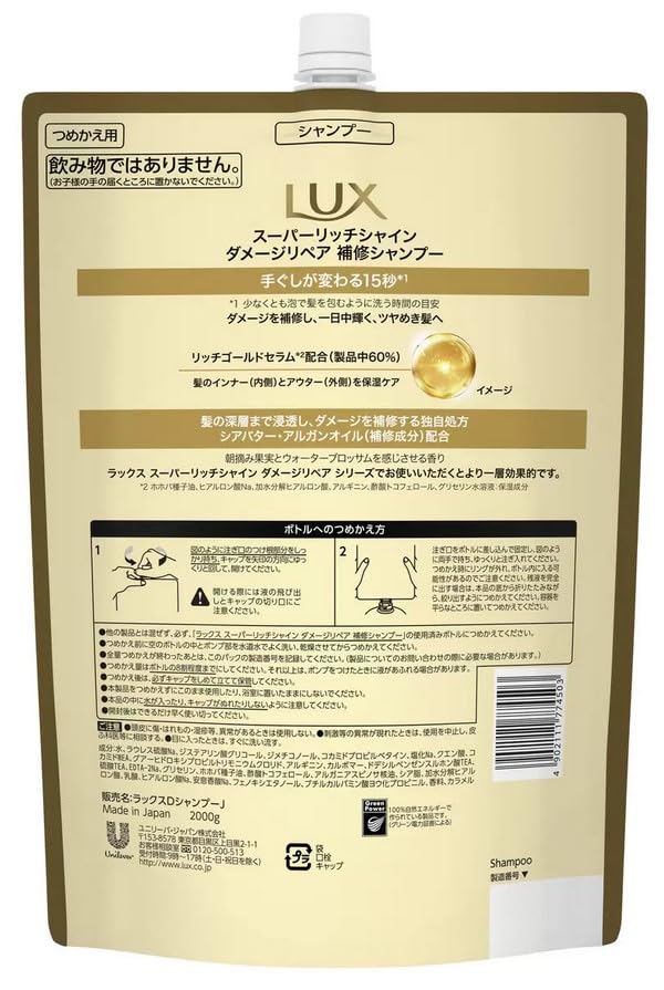 ラックス スーパーリッチシャイン ダメージリペア シャンプー 詰替え用 2kg。 商品紹介 ダメージを受けた髪も内側まで濃密に補修し、一日中ツヤめく髪へ。 通常サイズ(290g)の約6.9個分。 お得な大容量サイズになります。 原産国:日本 原材料・成分 製品ラベルに記載 安全警告 目に入れないで下さい。 30年間の研究を経て進化を遂げてきたラックス。 全面リニューアルを経て、輝き溢れるツヤ髪を実現する新処方設計に。 髪の外側だけでなく内側からしっかりケア出来る新処方設計。 リッチゴールドセラム(保湿成分)を製品中60%配合。 シアバター・アルガンオイル(補修成分)配合。 *¹ホホバ種子油、ヒアルロン酸Na、加水分解ヒアルロン酸、アルギニン、酢酸トコフェロール、グリセリン水溶液。 朝摘み果実とウォーターブロッサムを感じさせる香り。 S000-K9999