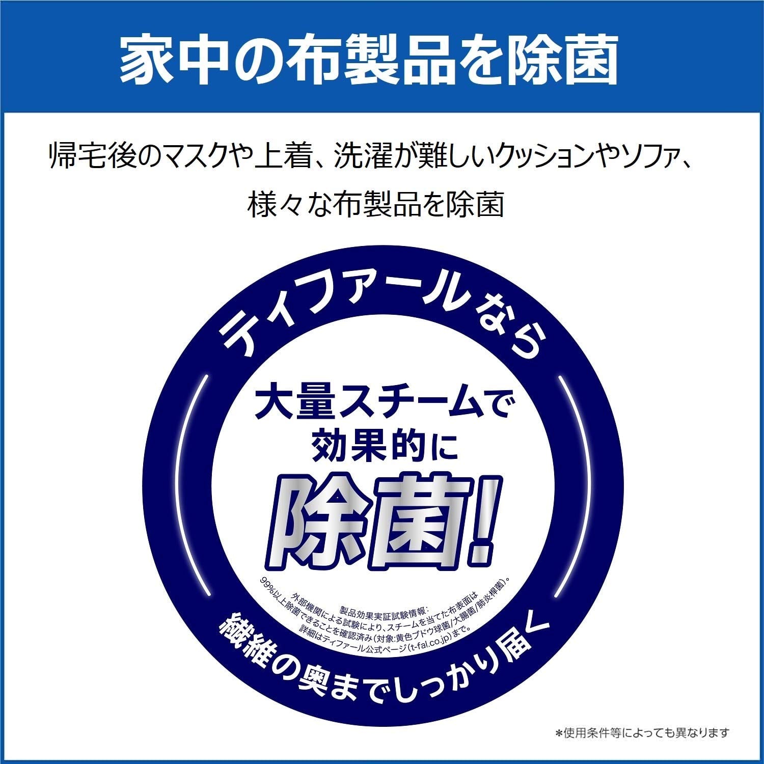 ティファール パワフル連続スチーム 平均約18g/分 衣類スチーマー 専用モデル 「アクセススチーム ブラック」 立ち上がり約40秒 スチームアイロン DT8111J0。 平均18g/分のパワフル連続スチームが、繊維の奥まで浸透し、シワの原因をしっかりほぐすので、シワをきれいにのばせます。 熱くなったヒーティングプレートを衣類にあてながらシワをのばすことで、さらにキレイな仕上がり。 ※プレスはできません 選べるスチーム量:ターボモード 平均18g/分、デリケートモード 平均14g/分 素早い立ち上がり:わずか40秒で起動します。 連続スチームでもラクラクトリガーロック 広範囲で使える3m電源コード 給排水に便利な取り外しできる水タンク:185mLの容量で、一度の給水でたっぷり使えます。 ※タンク内部の水滴について:本製品は工場出荷前にスチーム噴射検査を行っているため、水タンク内に水滴が残っている場合がございますが、製品のご使用には全く問題ございませんのでご安心ください。 製品効果実証試験情報 アクセススチーム ホワイト / アクセススチーム ブラック 試験依頼先:一般財団法人日本食品分析センター試験報告書発行年月日:2019年6月10日試験報告書発行番号:第19037200001-0101号試験方法:かけ面(高温時)を押し当てた菌付着布(試料)の除菌確認評価方法:試料にかけ面(高温時)を押し当てながらスチームを噴射。 試験は2種類の菌で実施。 試験結果:99%以上の除菌効果対象部分:衣類。 タンク内部の水滴について:本製品は工場出荷前にスチーム噴射検査を行っているため、水タンク内に水滴が残っている場合がございますが、製品のご使用には全く問題ございませんのでご安心ください。 サイズ:幅13×奥行14×高さ28cm、本体重量:約1.2kg。 電源:100V 50/60Hz、消費電力:1200W。 水タンク容量:185ml、スチーム量:平均18g/分。 付属品:ドアフック、アタッチメントブラシ、ヘッドカバー。 S000-K9999