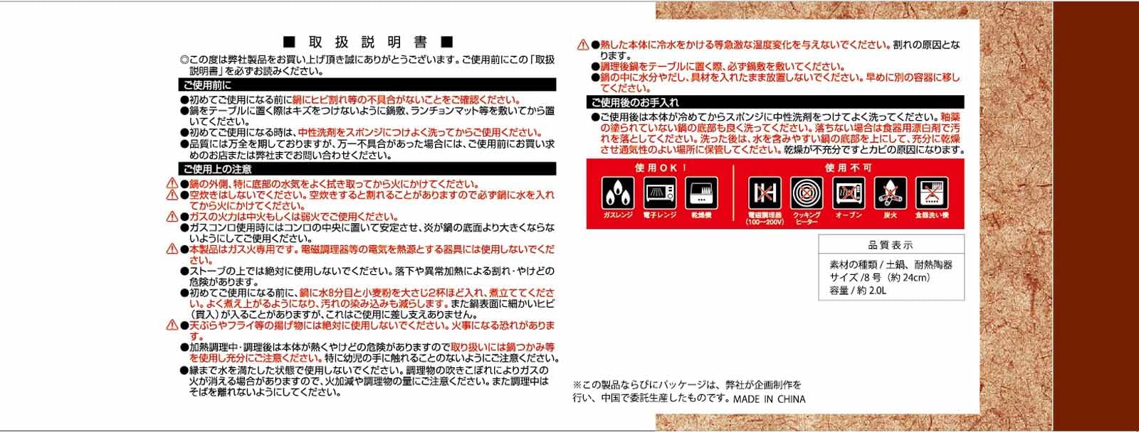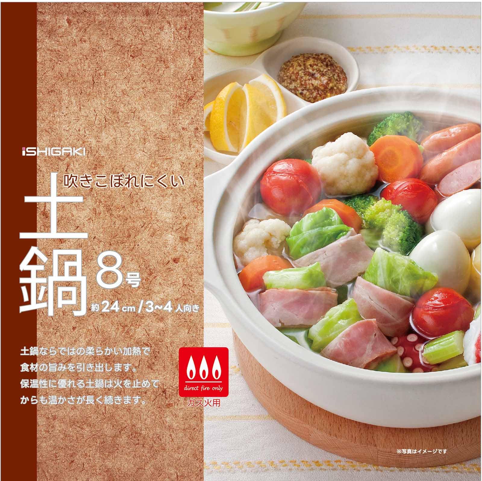 イシガキ 直火対応 吹きこぼれにくい土鍋 8号(3~4人用) 4502。 ガス火、電子レンジ使用可能。 IH調理器は使用不可 土鍋ならではの「遠赤外線」効果で食材本来の持つ旨味を引き出す 保温性も高いので温かさが持続しますので、熱々を長く楽しめる 容量約2.2L。 3~4人用 【ご使用上の注意】 鍋の外側、特に底部の水気をよく拭き取ってから火にかけてください 空焚きはしないでください。 空焚きすると割れる事がありますので必ず鍋に水を入れてから火にかけてください ガスの火力は中火もしくは弱火でご使用ください 本製品はガス火専用です。 電磁調理器等電機を熱源とする器具には使用しないでください 初めてご使用になる前に、鍋に水8分目と小麦粉を大さじ2杯ほど入れ、煮立ててください。 よく煮え上がるようになり、汚れの染みこみも減らします 鍋のフチまで水を満たした状態で使用しないでください 熱した本体に冷水をかける等急激な温度変化を与えないでください。 割れの原因となります 調理中、調理後は、高温になっておりますので、火傷等しないように充分ご注意ください 鍋をテーブル等に置く際は、鍋敷き等を敷いてから置いてください 調理物は鍋に入れたまま保存せずに他の容器に移してください 【ご使用後のお手入れ方法】 ご使用後は本体が冷めてからスポンジに中性洗剤をつけてよく洗ってください 釉薬の塗られていない鍋底部分もよく洗ってください。 落ちない場合は食器用漂白剤で汚れを落としてください。 洗浄後は鍋底を上にして、充分に乾燥させてください。 乾燥が不十分ですとカビの原因になります 食器洗い機の御使用は、出来ません 焦げ付きがある場合は、鋭利な物を使用せず、ぬるま湯に浸して柔らかくしてから取り除いてください。 サイズ(約):28×24×14.5cm、容量2.2L。 本体重量(約):2.12kg。 素材・材質: 本体/耐熱陶器、蓋/陶器。 対応熱源:ガス火、電子レンジ使用可。 S600-K9999