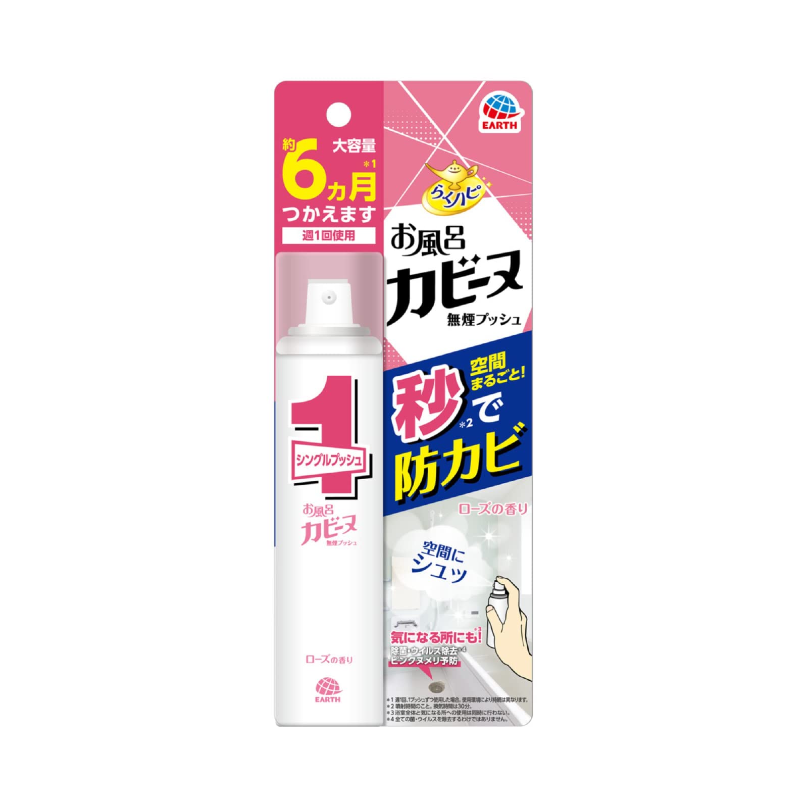 らくハピ お風呂カビーヌ無煙プッシュ 空間まるごと秒で防カビ [ローズの香り 6ヵ月分] 浴槽 浴室 カビを防ぐ (アース製薬)。 商品紹介 空間まるごと、秒(噴射時間のこと。 換気時間は30分。 )で防カビ お風呂上がり・お掃除仕上げに、1プッシュで空間まるごと防カビできる 濡れていても有効成分が浸透してカビ予防 除菌・ウイルス除去(全ての菌・ウイルスを除去するわけではありません。 )・ピンクヌメリ予防(気になる所に噴射した場合、除菌・ウイルス除去・ピンクヌメリ予防。 ) 気になる所にも(浴室全体と気になる所への使用は同時に行わない。 ) おもちゃ・小物は置いたままでOK 大容量、約6ヵ月つかえます(週1回、1プッシュずつ使用した場合。 使用環境により持続は異なります。 ) ローズの香り 【品名】浴室用カビ防止剤 【内容量】36mL(30プッシュ分) 原材料・成分 防カビ成分(イソプロピルメチルフェノール)、エタノール、香料 使用方法 ※本品はカビ取り剤ではありません。 黒カビを生えにくくする商品です。 ※はじめて使用する際は十分な量が出ないので2回程度空押ししてから使用してください。 あらかじめ黒カビを取り除いてから使用してください。 浴室内が濡れていてもお使いいただけます。 (1)換気扇はつけたまま使用する。 (換気扇がない場合は窓を10cmから15cm程度開ける) (2)【浴室全体にシュッ】必ず浴室の外に立ち、入り口から手を伸ばして、目線の高さで水平に1プッシュ。 もしくは、【気になる所にシュッ】必ず浴室の外に立ち、入り口から手を伸ばして、対象物と50cm以上の間隔をとった状態で1プッシュ。 (3)どちらの場合も噴射後はすみやかに扉を閉め、30分以上経過してから入室可能。 洗い流しは不要。 一度の使用は1プッシュまでとし、30分経過してから次の使用が可能。 高濃度のため、浴室全体と気になる所への使用は同時に行わない。 ※刺激を感じた場合は換気を行い、浴室から離れてください。 【使用の目安】週1回 【使用可能期間】約6ヵ月(使用環境により異なります。 30プッシュ分換算) 使うほど黒カビ掃除がいらなくなります。 お風呂上がり・お掃除仕上げに、1プッシュで浴室全体、空間まるごと防カビできる。 気になる所に直接使用すると除菌・ウイルス除去・ピンクヌメリ予防。 (全ての菌・ウイルスを除去するわけではありません。 )。 週1回使用で約6ヵ月分。 おもちゃ・小物は置いたままでOK!。 濡れていても有効成分が浸透してカビ予防。 S000-K9999