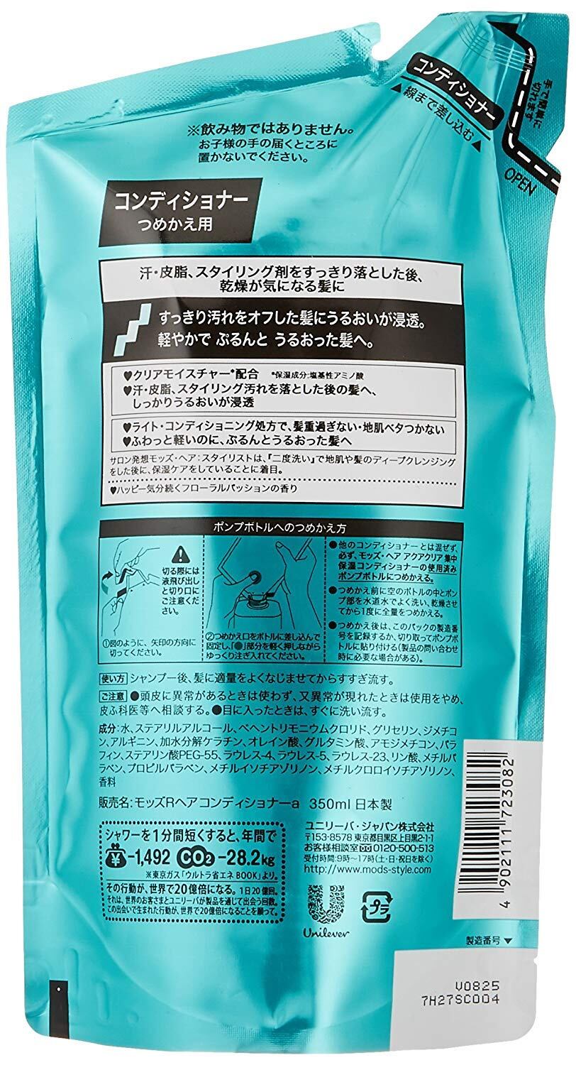 【3個セット】モッズ・ヘア アクアクリア 集中保湿コンディショナー つめかえ用 350ml×3個。 汗・皮脂、スタイリング剤をすっきり落とした後、乾燥が気になる髪にすっきり汚れをオフした髪にうるおいが浸透。 軽やかで ぷるんと うるおった髪へ。 クリアモイスチャー*配合* 保湿成分:塩基性アミノ酸汗・皮脂、スタイリング汚れを落とした後の髪へ、しっかりうるおいが浸透ライト・コンディショニング処方で、髪重過ぎない・地肌ベタつかないふわっと軽いのに、ぷるんとうるおった髪へサロン発想モッズ・ヘア:スタイリストは、『二度洗い』で地肌や髪のディープクレンジングをした後に、保湿ケアをしていることに着目。 ハッピー気分続くフローラルパッションの香り。 S000-K9999