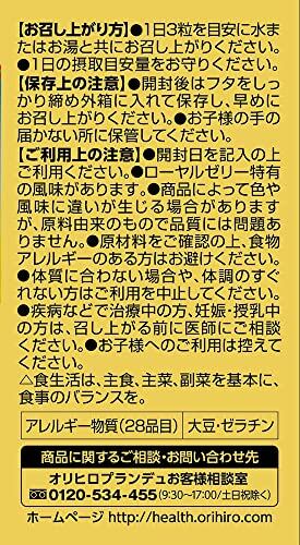 オリヒロ ローヤルゼリー3000 90粒。 商品紹介 チベット高原産ローヤルゼリー使用。 品質を損なわないようフリーズドライ(凍結乾燥)製法で粉末化したローヤルゼリーを使用。 ローヤルゼリー3000mg(生換算)。 1日目安量3粒中に生ローヤルゼリー換算3000mgとたっぷり配合しました。 安心の全国ローヤルゼリー公正取引協議会公正マーク付き1日3粒30日分(ハードカプセルタイプ) 若々しく美しい明日のために チベット高原は標高約3000mもの厳しい気候条件のため、細菌類が繁殖しにくく、安定した品質のローヤルゼリーを採集することができます。 本品はチベット高原産のローヤルゼリーを品質を損なわないようにフリーズドライ(凍結乾燥)製法で粉末化し、ハードカプセルに詰めました。 大自然の中で育まれたローヤルゼリーを貴方の大切な健康や美しさの維持にお役立てください。 内容画像 ハードカプセル 原材料・成分 乾燥ローヤルゼリー粉末(中国製造)、ビール酵母(大豆を含む)/ゼラチン、ステアリン酸Ca、着色料(二酸化チタン)。 製品1粒中ローヤルゼリー1000mg含有(生ローヤルゼリー換算)。 品質を損なわないようフリーズドライ(凍結乾燥)製法で粉末化したローヤルゼリーを使用。 内容量:90粒。 1日3粒30日分。 商品サイズ (幅×奥行×高さ) :サイズ:5.7×5.7×10cm。 S000-K9999
