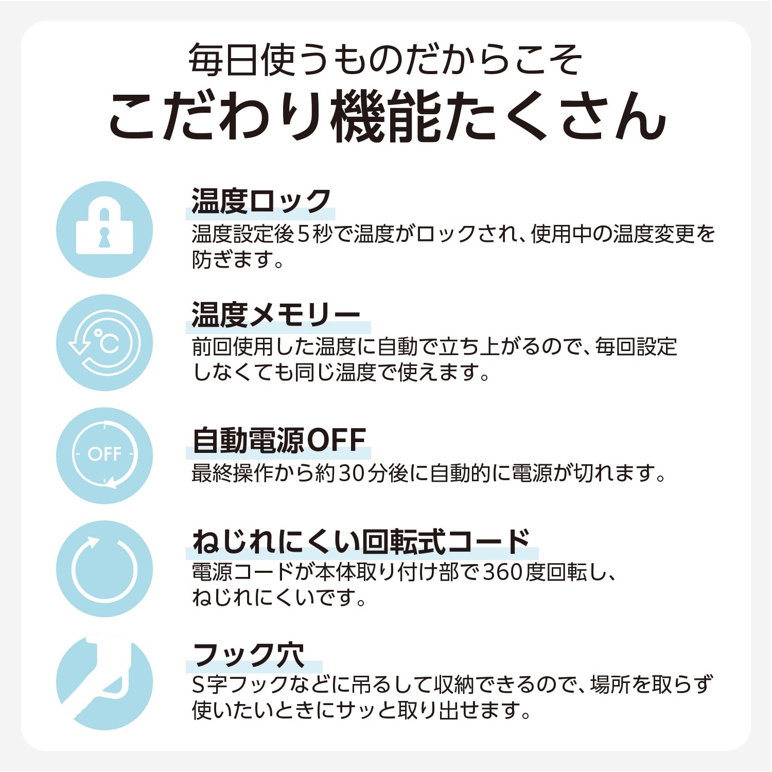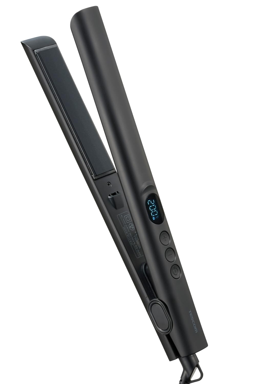 テスコム ストレートアイロン マイナスイオン ナノセラミックコーティング 25mm 120~200℃ 温度ロック/メモリー 海外対応 自動OFF 開閉ロック 専用ポーチ付 1.7m ブラック TS360A-K。 忙しい朝でも時短でサラツヤストレートに。 長さ110mmのロングプレートで毛束を一気に挟み、手早くスタイリングできるマイナスイオンストレートアイロンです。 毛先までしっかり捉えてひとすべりで美しいストレートを実現します。 縦110mmのロングプレートを採用。 ボリュームのある毛束も一気に挟めるため、忙しい朝も時短でスタイリングが可能です。 ロングヘアの方、毛量の多い方にもおすすめです。 すべりやすさ32%UP!粒子が細かい「ナノセラミック」を配合したコーティングで、摩擦ダメージに配慮した、ひっかかりのないスムーズな髪すべりを実現します。 ※チタンコーティングの当社ヘアアイロンとの比較。 両面3D「ぴたっと」プレート搭載。 髪の流れに沿って両面のプレートが上下左右に傾いて、細かな毛束にもしっかり密着。 毛先まで逃さず、ひとすべりでサラツヤストレートへ導きます。 温度は120℃/140℃/160℃/180℃/200℃の5段階で調節可能。 髪質や希望のスタイリングに合わせて設定できます。 S000-K9999
