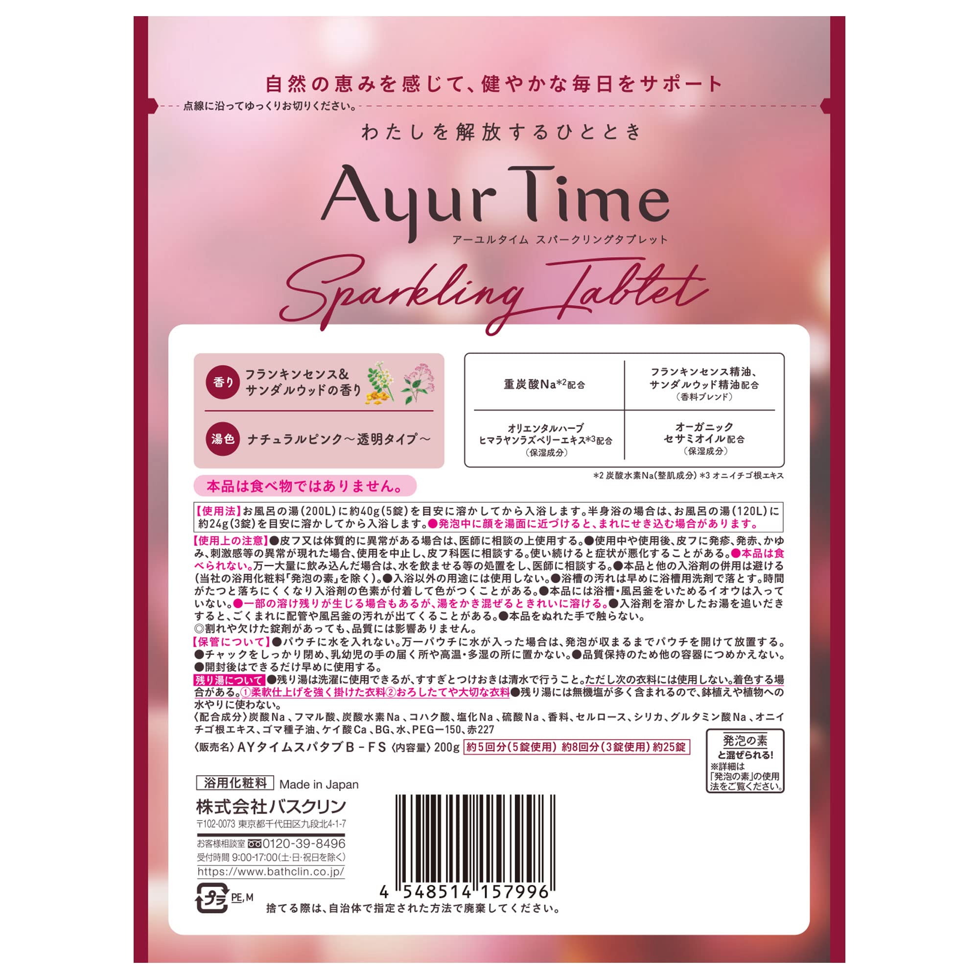 バスクリン アーユルタイム スパークリングタブレット フランキンセンス&サンダルウッドの香り [200g(約5回分)] 重炭酸タイプ 入浴剤 天然精油。 商品紹介 自然物の恵みを享受し、健やかな毎日をサポートする重炭酸Na*1配合の発泡タイプの入浴料です。 なめらかな肌とともに、上質な発泡と香りにより心地よい時間を。 ・重炭酸Na*¹配合。 ・天然精油配合(香料ブレンド)・香り:フランキンセンス&サンダルウッドの香り/レモングラス&ベルガモットの香り・湯色:ナチュラルピンク(透明)/リーフグリーン(透明)・オリエンタルハーブ ヒマラヤンラズベリーエキス*²配合(保湿成分)・オーガニックセサミオイル配合(保湿成分)(*1 炭酸水素Na(整肌成分) *2 オニイチゴ根エキス) 原材料・成分 配合成分:炭酸Na、フマル酸、炭酸水素Na、コハク酸、塩化Na、硫酸Na、香料、セルロース、シリカ、グルタミン酸Na、オニイチゴ根エキス、ゴマ種子油、ケイ酸Ca、BG、水、PEG-150、赤227 使用方法 複数タブレットタイプの入浴剤です。 お風呂の湯(200L)に約40g(5錠)を目安に使用してください。 半身浴の場合は、お風呂の湯(120L)に約24g(3錠)を目安に使用してください。 安全警告 皮フ又は体質的に異常がある場合は、医師に相談の上使用する。 使用中や使用後、皮フに発疹、発赤、かゆみ、刺激感等の異常が現れた場合、使用を中止し、皮フ科医に相談する。 使い続けると症状が悪化することがある。 本品は食べられない。 万一大量に飲み込んだ場合は、水を飲ませる等の処置をし、医師に相談する。 本品と他の入浴剤の併用は避ける(当社の浴用化粧料「発泡の素」を除く)。 入浴以外の用途には使用しない。 浴槽の汚れは早めに浴槽用洗剤で落とす。 時間がたつと落ちにくくなり入浴剤の色素が付着して色がつくことがある。 本品には浴槽・風呂釜をいためるイオウは入っていない。 一部の溶け残りが生じる場合もあるが、湯をかき混ぜるときれいに溶ける。 入浴剤を溶かしたお湯を追いだきすると、ごくまれに配管や風呂釜の汚れが出てくることがある。 本品をぬれた手で触らない。 【保管について】開封後はすぐに使用する。 乳幼児の手の届く所や高温・多湿の所に置かない。 【残り湯について】残り湯は洗濯に使用できるが、すすぎとつけおきは清水で行うこと。 ただし次の衣料には使用しない。 着色する場合がある。 (1)柔軟仕上げを強く掛けた衣料(2)おろしたてや大切な衣料残り湯には無機塩が多く含まれるので、鉢植えや植物への水やりに使わない。 重炭酸。 天然精油。 ボディー用。 S000-K9999