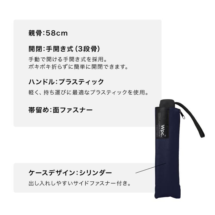 Wpc. 折りたたみ傘 BASIC FOLDING ブラック 雨傘 メンズ 晴雨兼用 大きい ベーシック シンプル 持ち手 太い 通勤 通学 UVカット 紫外線防止 はっ水 持続 おしゃれ 男性 女性 レディース UX001-900-002。 持つ人を選ばないベーシックな折りたたみ傘 男女兼用の折りたたみ雨傘です。 親骨58cm、開いた時の直径98cmと折りたたみ傘としては大きめで男性でも十分なサイズ感。 持ち手には樹脂素材を使用しているため滑りにくく、手にフィットする仕様です。 傘を巻く帯は太めの面ファスナー仕様で濡れた傘も楽に畳むことができます。 ユニセックス ベーシックフォールディング アンブレラ -UNISEX BASIC FOLDING UMBRELLA- 晴れの日も使える雨傘(晴雨兼用) この製品は雨傘としてお使い頂くことを主としていますが、紫外線防止効果があります。 但し、色の濃淡によって紫外線遮蔽率(UVカット率)が異なります。 次の数値を目安としてご参照ください。 淡色:約80%、濃色:約90% 継続はっ水 長期的に持続するはっ水加工を施しているため、一般の傘と比べ、はっ水が持続します。 ≪開閉方法≫ 手開き(イージーオープン)仕様。 ポキポキ折らずにスムーズに開閉できます。 ご使用になる前に製品に付属しているご使用上の注意をお読みください。 大きめ 柄 無地 シンプル シック ストライプ ボーダー チェック 黒 カーキ ネイビー 紺 グレー ベージュ カジュアル ビジネス 男性 女性 オシャレ 通勤 通学 [Wpc. / ダブリュピーシー] 国内売上TOP。 進化を続ける傘ブランド。 「Wpc.」は『新たな可能性を生み出す』をスローガンに2004年に誕生した日本発のレイングッズブランド。 様々な世代やジャンルの方に傘を持つことへの美意識を発信し続けます。 そして雨の日も晴れの日も幸せを感じてもらえる製品をお届けします。 【持つ人を選ばないベーシックな折りたたみ傘】 男女兼用の折りたたみ雨傘です。 親骨58cm、開いた時の直径98cmと折りたたみ傘としては大きめで男性でも十分なサイズ感。 持ち手には樹脂素材を使用しているため滑りにくく、手にフィットする仕様です。 傘を巻く帯は太めの面ファスナー仕様で濡れた傘も楽に畳むことができます。 【晴れの日も使える雨傘(晴雨兼用)】 この製品は雨傘としてお使い頂くことを主としていますが、紫外線防止効果があります。 但し、色の濃淡によって紫外線遮蔽率(UVカット率)が異なります。 次の数値を目安としてご参照ください。 淡色:約80%、濃色:約90%。 【継続はっ水】 長期的に持続するはっ水加工を施しているため、一般の傘と比べ、はっ水が持続します。 ≪開閉方法≫ 手開き(イージーオープン)仕様。 ポキポキ折らずにスムーズに開閉できます。 (検査機関:一般財団法人 日本繊維製品品質技術センター/発行日:2023年6月19日)。 S350-K9999