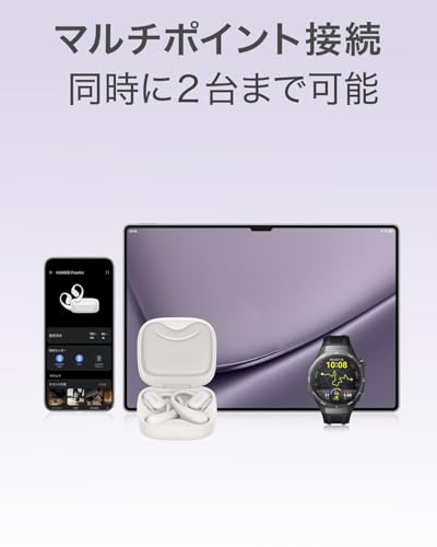 HUAWEI FreeArc オープンイヤー ワイヤレスイヤホン 耳掛け Bluetooth 快適な装着感 IP57防水 28時間再生 iOS/Andriod対応 グレー。 【運動中でも安定した装着感】 ステントなどの医療器具や航空宇宙産業、ロボット工学などに使用されるニッケルチタン形状記憶合金と生体適合性に高く、肌に優しく、アレルギー反応を起こしにくい35A液状シリコーンを採用し、一日中快適で確実なフィット感を実現。 【3つの安定化設計で快適な装着感を実現】: 10,000件以上の耳介データを分析し形状の微調整を行い、最適なカーブで形成したC-bridge Design。 アコースティックボール、C-bridge Design、バッテリーの3つの重心部分の重さを調整し、3つの支点でイヤホンの安定性を向上させた三角形設計。 最も安定したバランスでデザインした重心バランス設計で、激しい運動でも、ズレにくく、落ちにくい。 【音漏れ軽減】: 指向性音声伝送技術により、音を出すスピーカーとは反対側に逆位相の音波を出すことで音漏れを軽減。 【IP57防水仕様】:特殊な防水マイクを搭載しているため、汗や雨を気にせず運動をすることが可能。 HUAWEI初のIP57レベルの防水に対応。 【優れた音質】: 17x12mm 高感度ドライバーユニットを搭載。 高音域にはPENチタンコーティングを施し、豊かで解像度の高いディテールを再現。 低音域には柔らかく弾力性のあるPUチタンプレーティング複合振動板を採用し、パンチのある低音を実現。 高性能ネオジム磁石を使用し、高い駆動力を実現することで、小型で大音量を実現。 S000-K9999