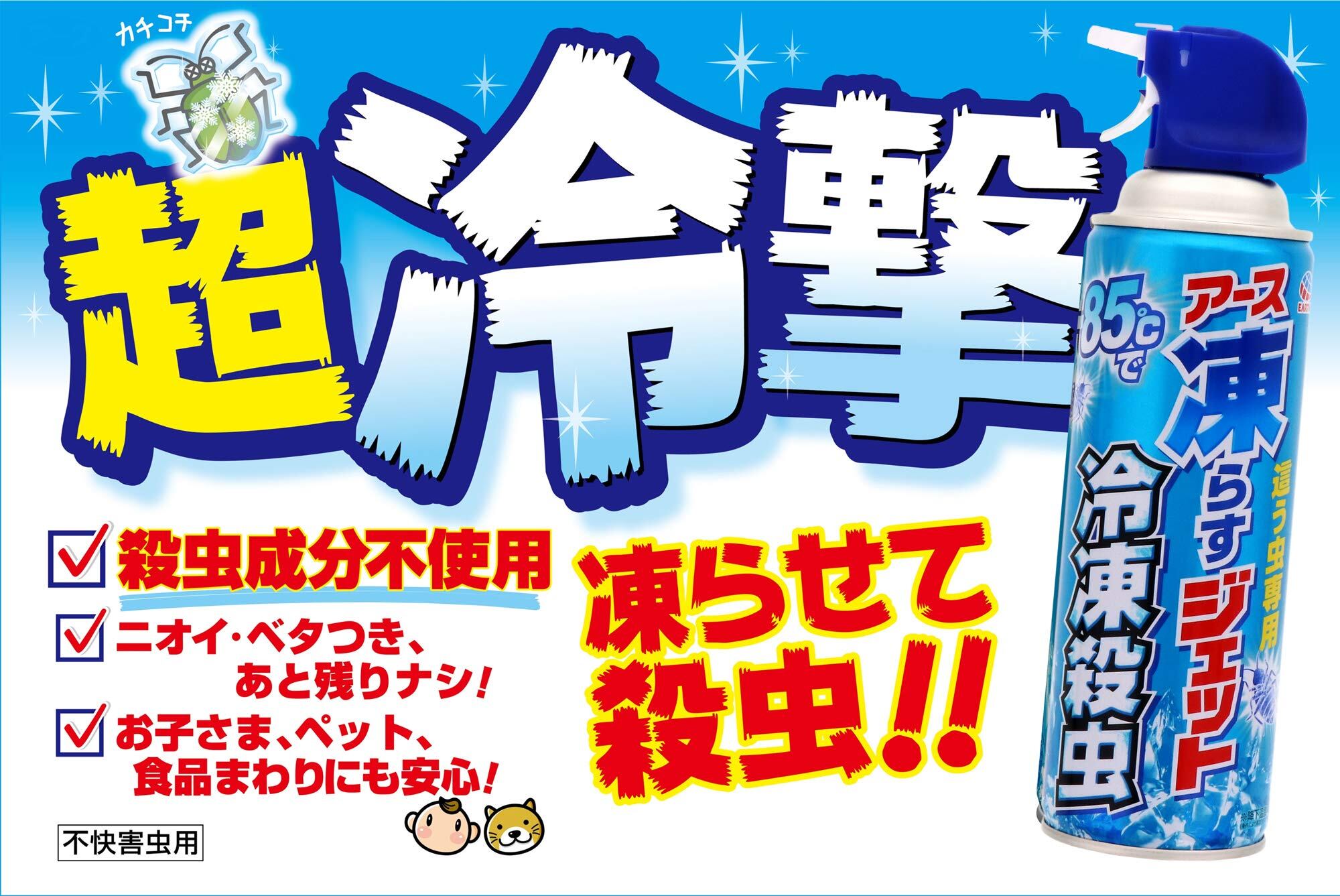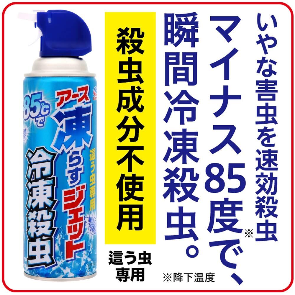 凍らすジェット冷凍殺虫 殺虫スプレー [300mL]。 商品紹介 【 1.使用に際しての注意 】 30秒以上連続噴射しないでください。 使用前に必ず製品表示を読み、十分理解した上で使用してください。 定められた使用方法を守ってください。 火炎に向かって噴射しないでください。 キッチン等で使用する場合は、コンロや湯沸器等の火(種火)、浴室などで使用する場合は、給湯器等の種火を切ってから使用し、使用後は十分換気してください。 引火・爆発のおそれがあります。 噴霧が裸火や暖房器具(ファンヒーターやストーブ等)に触れると有毒ガスが発生するので、火気のある場所の付近では使用しないでください。 噴射によってできる氷塊には、燃焼のおそれがあるので火気を近づけないでください。 ガス警報器が作動する危険があるので、注意してください。 皮膚、飲食物、食器、子供のおもちゃ、観賞魚、小鳥などのペット類、飼料、植物にかからないようにしてください。 植物に直接かかると植物をいためる場合があります。 変色、シミのおそれがあるので、壁、床、家具、建具、大理石や御影石等の石材や自動車などの塗装面にかからないようにしてください。 【 2.使用中又は使用後の注意 】 人体に向かって噴射しないでください。 また、噴射気体を吸入しないでください。 噴射中は喫煙、飲食等はしないでください。 閉め切った場所で大量に使用しないでください。 使用中に気分が悪くなった場合は使用を中止し、通気の良いところで安静にしてください。 本品には凍結効果があり、皮膚に冷却成分がかかると凍傷を起こすことがあるので、皮膚についた場合は、すぐに水で洗ってください。 また、目に入った場合は、直ちに水でよく洗い流してください。 万一、身体に異常が起きた場合は、医師の診療を受けてください。 パソコン、AV機器、電灯等の周りでは使用しないでください。 換気してください。 【 3.保管及び取り扱い上の注意 】 直射日光や火気を避け、子供の手の届かない涼しいところに保管してください。 缶のさびを防ぐため、水周りや湿気の多い場所には置かないでください。 容器が錆びてガス漏れや破裂を引き起こすおそれがあります。 暖房機器(ファンヒーター等)の周囲と高温になる場所、車内は温度が上がり、破裂するおそれがあるので置かないでください。 【 4.廃棄上の注意 】 本品は、使い切ってから捨ててください。 捨てるときは、風通しが良く、火気のない屋外で風下に向かって人にかからないように噴射レバーを引き、噴射音が消えるまでガスを抜いて、各自治体の定める方法で廃棄してください。 超冷撃効果でいやな害虫を速効殺虫! 殺虫成分不使用で溶剤フリーのエアゾール。 マイナス85度※の超冷撃効果で、瞬時に昆虫の生理機能を停止させ、神経興奮が起きる間も与えず速効殺虫します。 ※降下温度(条件により異なります) 特殊冷却ノズル採用! 特殊冷却ノズルは、広範囲に冷却剤を広がらせるとともに、冷却剤を中心部分に集中させ、効果的に冷却し高い殺虫効果を発揮します。 殺虫成分不使用&溶剤フリーの殺虫エアゾール。 使用しているのは冷却剤です。 そのため、お子様やペット、食品まわりにも安心で、室内でもご使用いただけます。 また、溶剤フリーなので、イヤなニオイやベタつき、あと残りもありません。 【適用害虫】ムカデ、ゲジゲジ、ヤスデ、ダンゴムシ、ワラジムシ、ケムシ、クロアリ、シロアリ、カメムシ、クモ 原材料・成分 有効成分:HFO-1234Ze、DME 安全警告 使用時・使用後には注意が必要です。 商品サイズ (幅×奥行×高さ) :70mm×66mm×230mm。 内容量:300ML。 ブラント名:アースジェット。 メーカー名: アース製薬。 原産国名: 日本。 S000-K9999