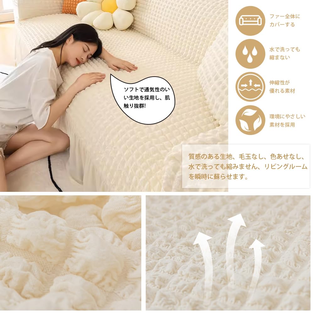 ソファーカバー 1-3人掛け 肘付き 北欧風 フリル マルチカバー 肘あり ストレッチ素材 伸縮性良く おしゃれ 汚れ防止 キズ防止 柔らかい ふわふわ ソファー保護 猫犬 洗える 厚手 優しい肌触り感 四季適用。 伸縮性が優れる素材:一人掛け90~140cm、 二人掛け145~185cm、三人掛け190~230cm、 四人掛け235~300cm 人工測量なので、多少の誤差がある場合がございます。 ご購入頂く前に、ご自宅のソファーサイズを先にご測量ください。 わからない場合は、大きいサイズを使用してください。 (クッションカバーがありません)。 おしゃれなデザイン:裾はスカートデザインで、質感のある生地、毛玉なし、色あせなし、水で洗っても縮みません、リビングルームを瞬時に蘇らせます。 四季節も通用でき、防塵、キズ防止などの機能あり、ソファーをしかっりと保護できます。 通気性いい:ソフトで通気性のいい生地を採用し、肌触り抜群!!優れたストレッチ性で、お手持ちのソファにぴったりフィットします。 座面や肘掛までピッタリ!ブカブカしない!丈夫でペットの爪による傷や汚れや水などからソファを守ることができるソファーカバーです。 伸縮素材:肌に優しい、伸縮性も良く(耐磨耗性が高い)、ソファカバーが変形しにくい、簡単に着脱でき、肘付きソファーに適用します。 家にペットと育ち盛りのお子様いつても安心して使用できます。 *製品についてどんな問題があれば、ご遠慮なくて連絡お願いします。 一人でも簡単に取り付け:背もたれの部分からカバーを少しずつかけてください。 ソファー全体にカバーをかけます。 最後にカバーの形を整えます。 生地が余っている場合は、セット揃いの棒で座面隙間に挟み込んでください。 【商標 登録6317802】。 S000-K9999