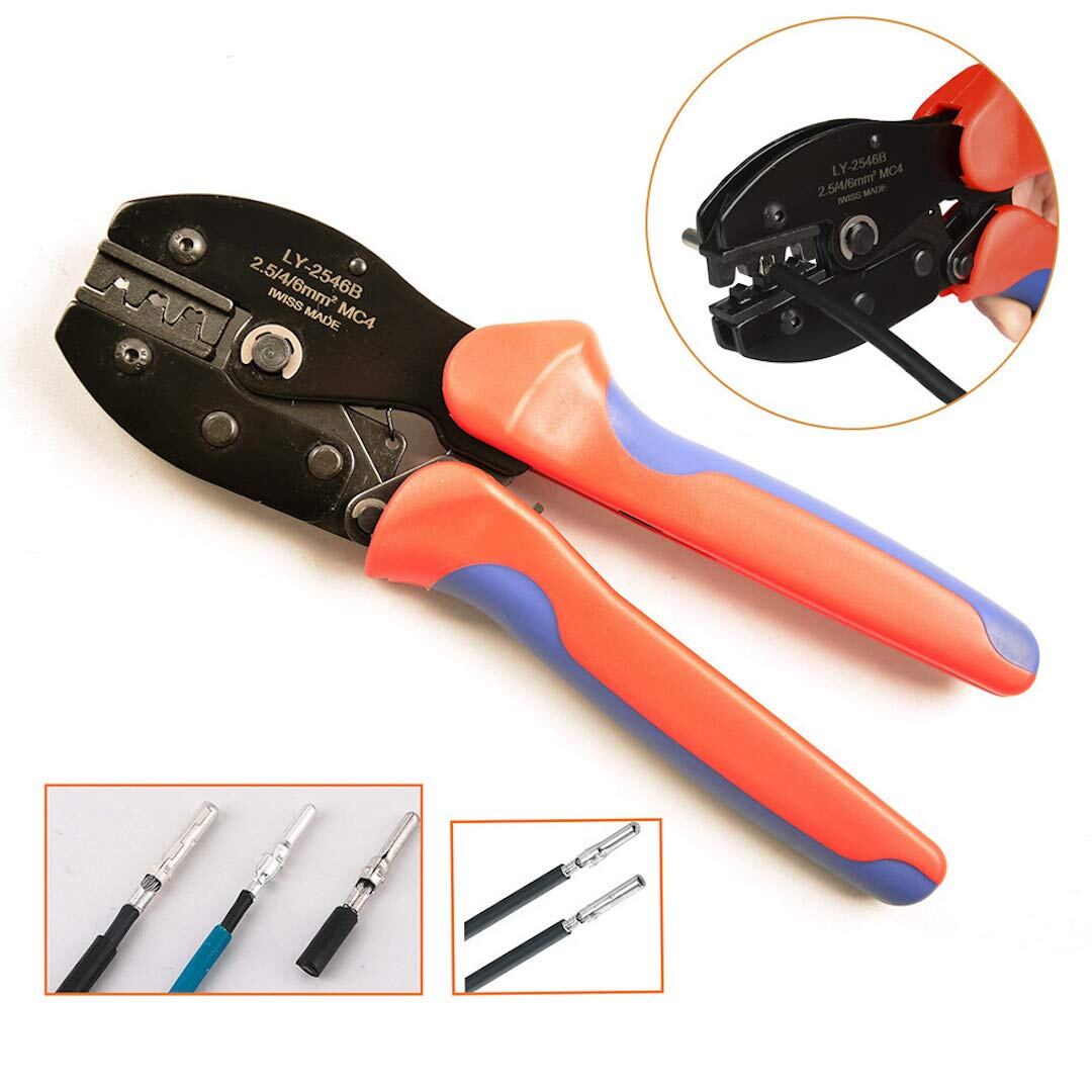 アイウィス(IWISS) 太陽光 ソーラーパネル MC4コネクタ 専用ペンチ 圧着 工具 2.0-6.0mm2 LY-2546B。 全長:220mm ; 重量:500g。 圧着能力:2sq~2.5sq、3.5sq~4sq、5.5sq~6sq (AWG14-10)。 仕様:ラチェット式。 特徴:ラチェット機能を備えている為、通常のペンチ同様、単純にハンドルを握り込むだけの操作で、確実に端子を圧着させることが可能で、配線作業を非常に簡単に行うことが可能です。 適合:ソーラーコネクタMC4ピンコンタクト(2.0sq、3.5sq、5.5sqソーラーケーブル・H-CV線・PV-CC線にも対応)。 S000-K9999