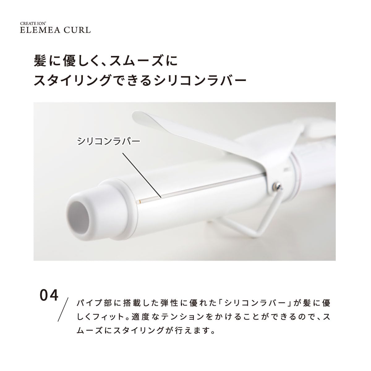 公式ストア限定クレイツイオン エレメアカール 38mm 海外兼用 ゆる巻き 韓国スタイル 髪に優しい オリジナルミラー付(オリジナルミラーセット)SC-G73312W。 メーカー公式限定:オリジナルミラー付き 髪の水分バランスを整え、美しいツヤを生み出すパーソナルカールアイロン プレミアムクレイツイオンの「遠赤外線」効果により、スタイリング時に失われがちな毛髪水分の蒸散を抑え、髪内部の水分バランスを整えながらしっかりと「潤い」を保持。 使うたびに潤いとツヤを取り戻し、美しいカールを長時間キープします。 使うたび髪にうるおい、とろん、ふわっとカール プレミアムクレイツイオンシリコンラバー加工を搭載。 適度なテンションをかけることができ、ご自宅でも思わず触れたくなるような柔らかなカールに。 プレミアムクレイツイオンが「潤い」を閉じ込め水分の蒸散を制御 [アイロン施術後(180℃設定時)の毛髪重量測定] 同一人物の毛束に設定温度180℃で加熱したヘアアイロン2種(A:従来のクレイツイオン加工アイロン、B:エレメアカール)で3秒間熱を与え、施術後の毛髪重量を計測。 施術前の毛髪重量を100とした場合、「A」で施術した毛髪は施術前に比べ40%減少、「B」で施術した毛髪は、30%減少という計測結果から、「B」のエレメアカールは、「A」の従来のクレイツイオン加工アイロンに比べ、毛髪水分の蒸発を抑制する効果があることを実証。 ※検体は、ダメージ毛にて計測。 ひとりひとりの適温でキューティクルを守る。 髪質や毛髪状態に合わせて設定できる10段階温度調節機能。 40℃〜220℃まで20℃毎の10段階で温度調節ができるので、髪質や毛髪状態(ダメージレベル)に合わせた最適な温度でスタイリングが可能です。 プレミアムクレイツイオンとは 数十種類のミネラルを含む天然鉱石から放出される「遠赤外線(育成光線)」の効果をさらに高めた、クレイツ独自の技術で開発した天然多元素含水ミネラル鉱物。 重量:本体:26mm(約220g コード込:約365g),32mm(約285g コード込:約430g),38mm(約305g コード込:約440g)。 サイズ:26mm(約L340×H80mm×W50),32mm(約L340×H80mm×W50),38mm(約L340×H80mm×W60)。 プレート温度:約120~200℃(5段階温度調節)。 海外兼用・自動電源OFF(最後のボタン操作から約1時間後に自動電源OFF)。 S000-K9999