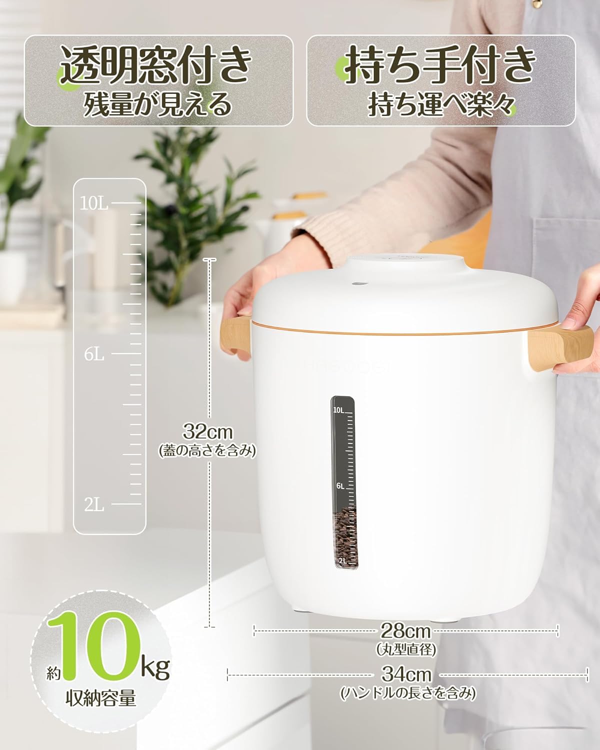 真空保存容器 自動真空 保存容器 防虫/湿気防止/酸化防止 米櫃 10L 大容量 密閉容器 梅雨対策 フードストッカー 充電式 真空容器 ワンプッシュ使用簡単 自動空気抜き お米/ペットフード 猫犬フード 鮮度キープ ABS食品級素材 袋のまま保存収納 (白)。 ️【自動真空・梅雨対策】2025年最新進化版として、真空保存容器は従来よりも優れた高感度気圧センサーを搭載し、容器内の空気圧が-15KPaを超えると自動的に感知し、気圧を-20Kpaに調整・維持します。 真空容器は一般的な密閉容器と比べ、密閉性能が高いだけでなく、容器内に残った酸素や湿気も除去し、常に乾燥状態と新鮮さを保ちます。 お米やペットフードの保存に最適な容器です。 10kg用の米櫃としても優れています。 ️【ワンプッシュで鮮度キープ】ボタンを押すだけで、この真空保存容器は1秒以内に真空脱気を開始!2層シールリング設計を採用し、容器本体との接触面を広げることで気密性を向上させ、防虫・防湿に効果的です。 さらに、『酸化防止×光劣化防止』にも優れており、米櫃(びつ)やペットフードストッカーとして最適です。 ジメジメとした蒸し暑い梅雨の時期に欠かせない密閉容器です。 ️【大容量10L】真空保存容器は、食品級ABS素材を使用しており、健康的で無臭です。 10Lの大容量で、お米13kg(ほぼ米櫃10kg相当)やペットフード(ドッグフードやキャットフードなど)5kg、さまざまな乾物を一度に保存可能。 小分け収納の手間から完全に解放されます。 優れたライスストッカーおよびペットフードストッカーとして、キッチンの整理整頓が苦手な方に特におすすめです!。 ️【多用途・経済的】真空フードストッカーは、お米やペットフード、プロテインパウダー、ナッツ、乾物など、さまざまな食品の保存に適しています。 食品を湿気や酸化からしっかりと保護し、従来の保存容器と比べて食品の賞味期限を2~4倍に延長できます。 これにより、食品ロスや無駄な出費を効果的に削減できる点も魅力です。 ライスストッカー(米びつ)やペットフードストッカーとしてもおすすめです。 ️【持ち運び・お手入れ簡単】この真空容器は大口径設計で、収納がしやすくなっています。 高級感あふれる木目調の取っ手が2つ付いており、おしゃれで持ち運びも便利です。 さらに、保存容器本体は丸洗い可能で、ペットフード(犬や猫用など)による油汚れが付着しても簡単に洗えるため、常に清潔を保てます。 ️【TYPE-C充電式】真空容器は、自動真空保存機能で脱気の手間を省き、手動式よりもさらに便利です。 この密閉容器は2000mAhの大容量バッテリーを搭載しており、一度フル充電すれば連続20日以上も使用可能です。 S000-K9999