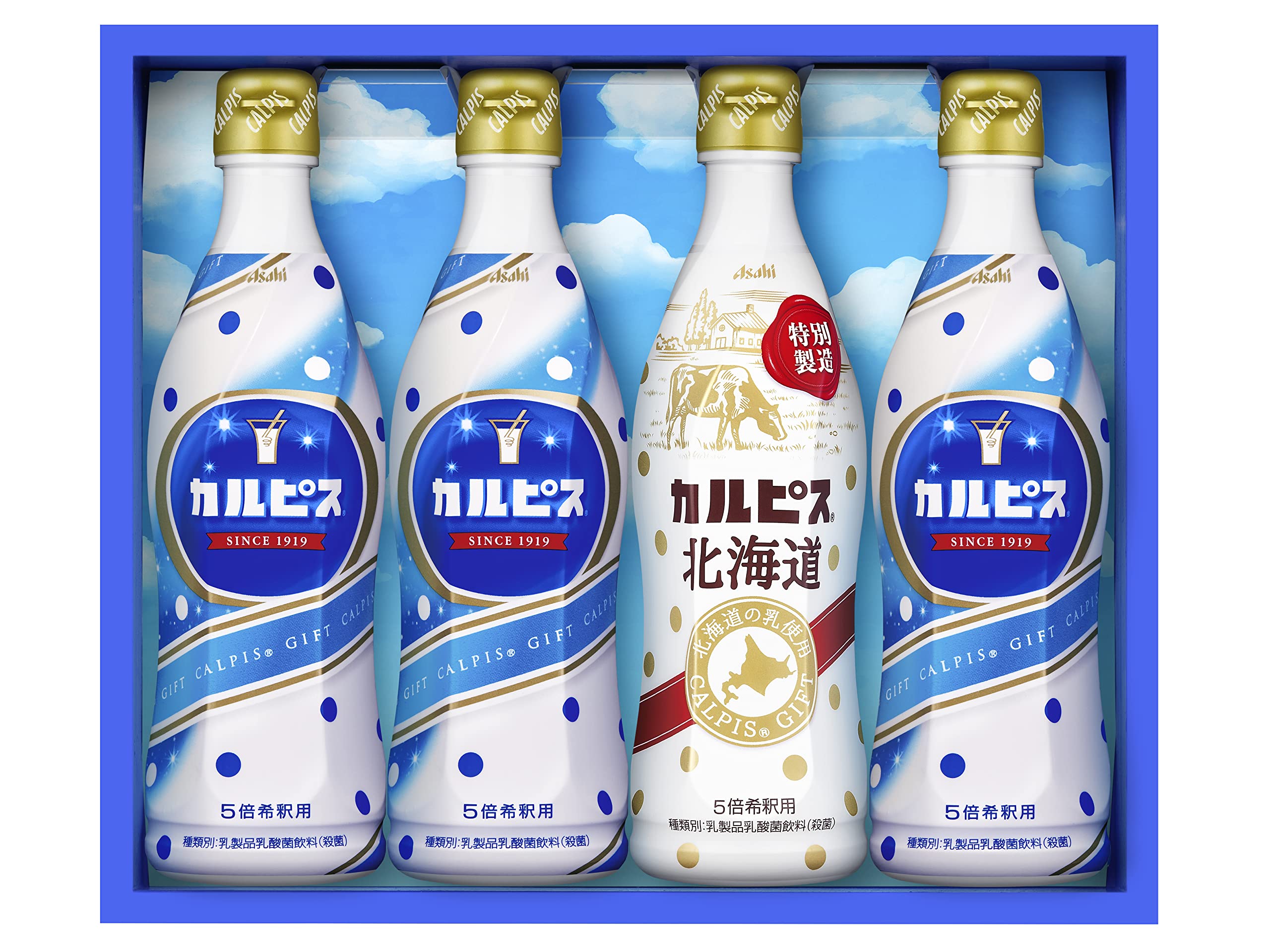 カルピス ギフト CN20P。 商品紹介 商品紹介 生乳と乳酸菌がつくりだしたさわやかな味わいの「カルピス」とギフト限定品の「カルピス」北海道をアソートしました。 乳酸菌と酵母、発酵という自然製法が生みだす独自のおいしさや香りの成分には、カラダにうれしい「チカラ」があることがわかってきています。 ・友人やお世話になった人のへのちょっとした贈り物に・ギフト限定商品を自分へのご褒美に「カルピス」470ml・・・3本「カルピス」北海道470ml(ギフト限定)・・・1本 原材料・成分 カルピス3本・カルピス北海道1本・各470ml ご注意(免責)>必ずお読みください ・開栓後は要冷蔵 ・開栓後はお早めにお飲みください。 ・開栓後に常温で放置すると、容器が破裂したりキャップがとぶことがあります。 続きを見る 原材料・成分 カルピス3本・カルピス北海道1本・各470ml 使用方法 1. 乳を470ml、砂糖を12g、香料を10mg、大豆多糖類を12.5mgの順に入れて混ぜます。 2. 大きなグラスに氷を入れ、混ぜた液体を注ぎます。 3. 好きなだけ水を加えて、混ぜます。 4. 完成したカルピスを飲みます。 ご注意(免責)>必ずお読みください ・開栓後は要冷蔵 ・開栓後はお早めにお飲みください。 ・開栓後に常温で放置すると、容器が破裂したりキャップがとぶことがあります。 原材料:・「カルピス」470ml:乳、砂糖、香料、大豆多糖類<br>・「カルピス」北海道470ml:乳、砂糖、香料。 商品サイズ(高さx奥行x幅):7.7cm×25.2cm×30.2cm。 S000-K9999