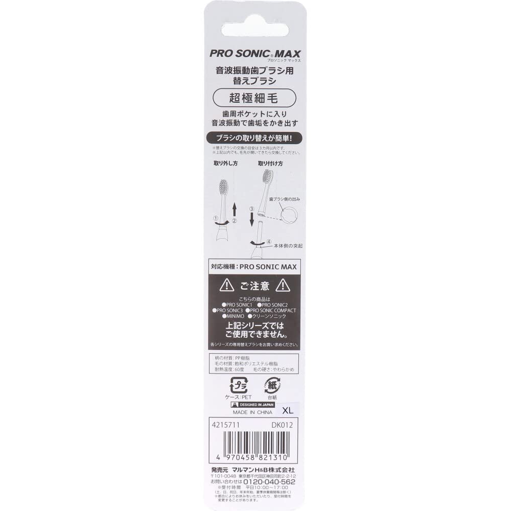 マルマン 音波振動歯ブラシ プロソニックMAX やわらかめ 替えブラシ DK012 2本入。 4970458821310。 歯と歯茎の隙間も磨きやすい プロソニックMAX DH220BL 交換用替えブラシ。 S000-K9999