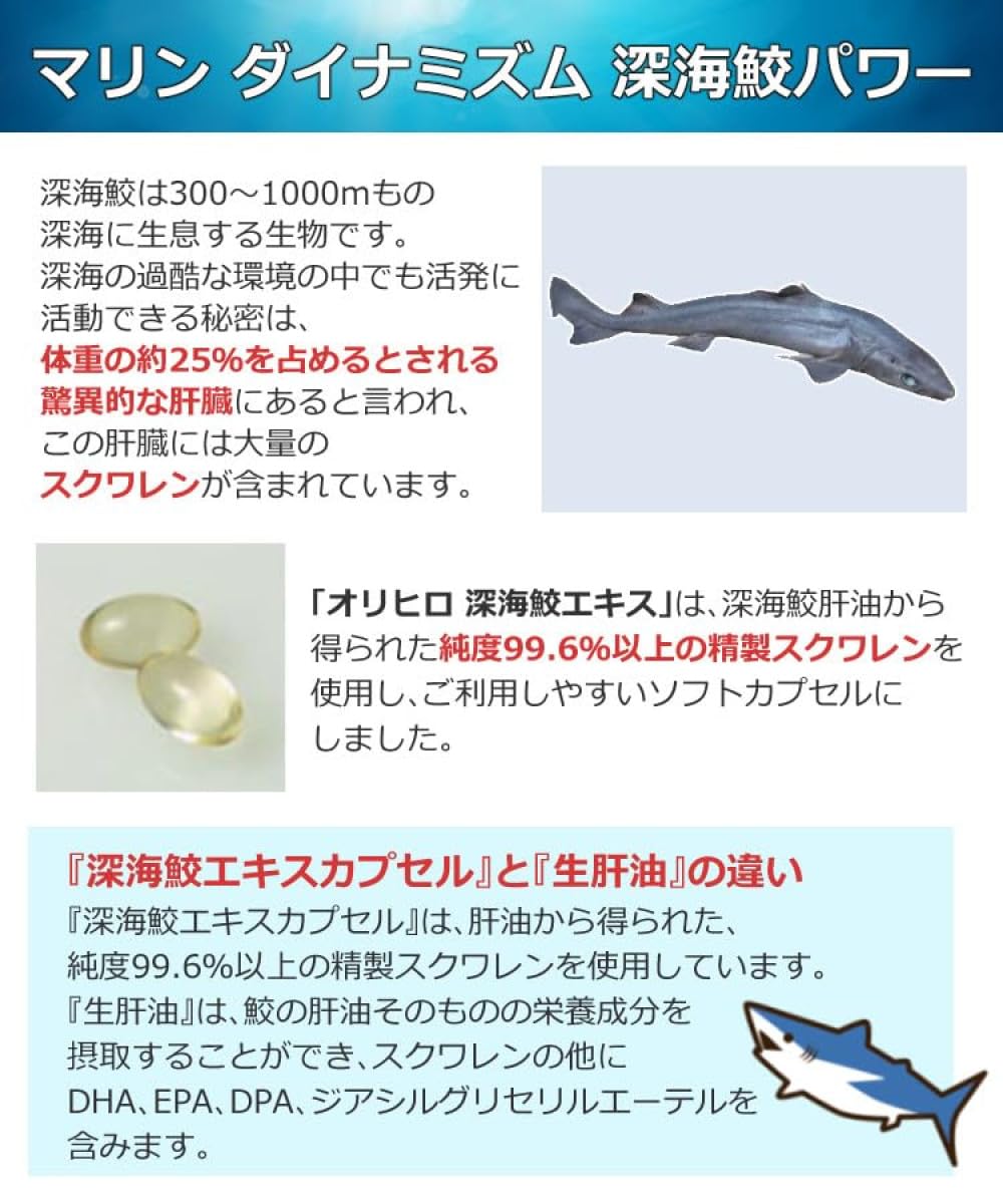 オリヒロ 深海鮫エキス カプセル徳用 360粒 [6点セット]。 ※賞味期限2年以上の商品をお届けしております 【6点セット】オリヒロ 深海鮫エキスカプセル徳用 360粒 肝油から得られた純度99.6%以上の精製スクワレンのみを使用し、 ご利用しやすいソフトカプセルに。 お得な2か月分。 原材料名:深海鮫精製肝油、ゼラチン、グリセリン 主要成分:製品6粒中(6粒2640mg/ゼラチンカプセル含む): 深海鮫精製肝油(スクワレン99.6%以上含有) 1800mg 【お召し上がり方】 1日に6粒程度を目安に、お食事時などに数回に分けて、 水またはお湯と共にお召しお上がりください。 のどに違和感がある場合は水を多めに飲んでください。 初めてご利用いただくお客様は少量からお召し上がりください。 空腹時の大量の摂取は控えてください。 1日の摂取目安量はお守りください。 【アレルギー表示対象原料】 ゼラチン。 【まとめ買い 6個セット】オリヒロ 深海鮫エキスカプセル徳用360粒。 『マリン ダイナミズム 深海鮫パワー』深海鮫は300~1000mもの深海に生息する生物です。 深海の過酷な環境の中でも活発に活動できる秘密は、体重の約25%を占めるとされる驚異的な肝臓にあると言われ、この肝臓には大量のスクワレンが含まれています。 本品は深海鮫肝油から得られた純度99.6%以上の精製スクワレンを使用し、ご利用しやすいソフトカプセルにしました。 ストレス社会で過ごす現代人にオススメの利用しやすいソフトカプセルです。 1瓶お得な2ヶ月分。 【スクワレンとは】深海鮫の肝臓を絞って得られる油(=肝油)の主成分。 過酷な環境で生き抜くために肝臓が重要な役割を果たしていると考えられており、古くから漁師などが健康維持のために活用してきました。 お酒が好きな方、油っぽい食事の好きな方にオススメです。 【お召し上がり方】1日に6粒程度を目安に、お食事時などに数回に分けて、水またはお湯と共にお召し上がりください。 【良くあるご質問】Q:『深海鮫エキスカプセル』と『生肝油』の違いは何ですか?/A:『深海鮫エキスカプセル』は、肝油から得られた、純度99.6%以上の精製スクワレンを使用しています。 『生肝油』は、鮫の肝油そのものの栄養成分を摂取することができ、スクワレンの他にDHA、EPA、DPA、ジアシルグリセリルエーテルを含みます。 内容量:360粒(1粒440mg/内容液300mg)/1日目安量:6粒/原材料名:深海鮫精製肝油/ゼラチン、グリセリン/主要成分:製品6粒中(6粒2640mg/ゼラチンカプセル含む): 深海鮫精製肝油 1800mg(スクワレン99.6%以上含有)/成分:熱量19kcal、たん白質0.60g、脂質1.71g、炭水化物0.27g、食塩相当量0~0.2g/アレルギー表示対象原料:ゼラチン。 S600-K9999