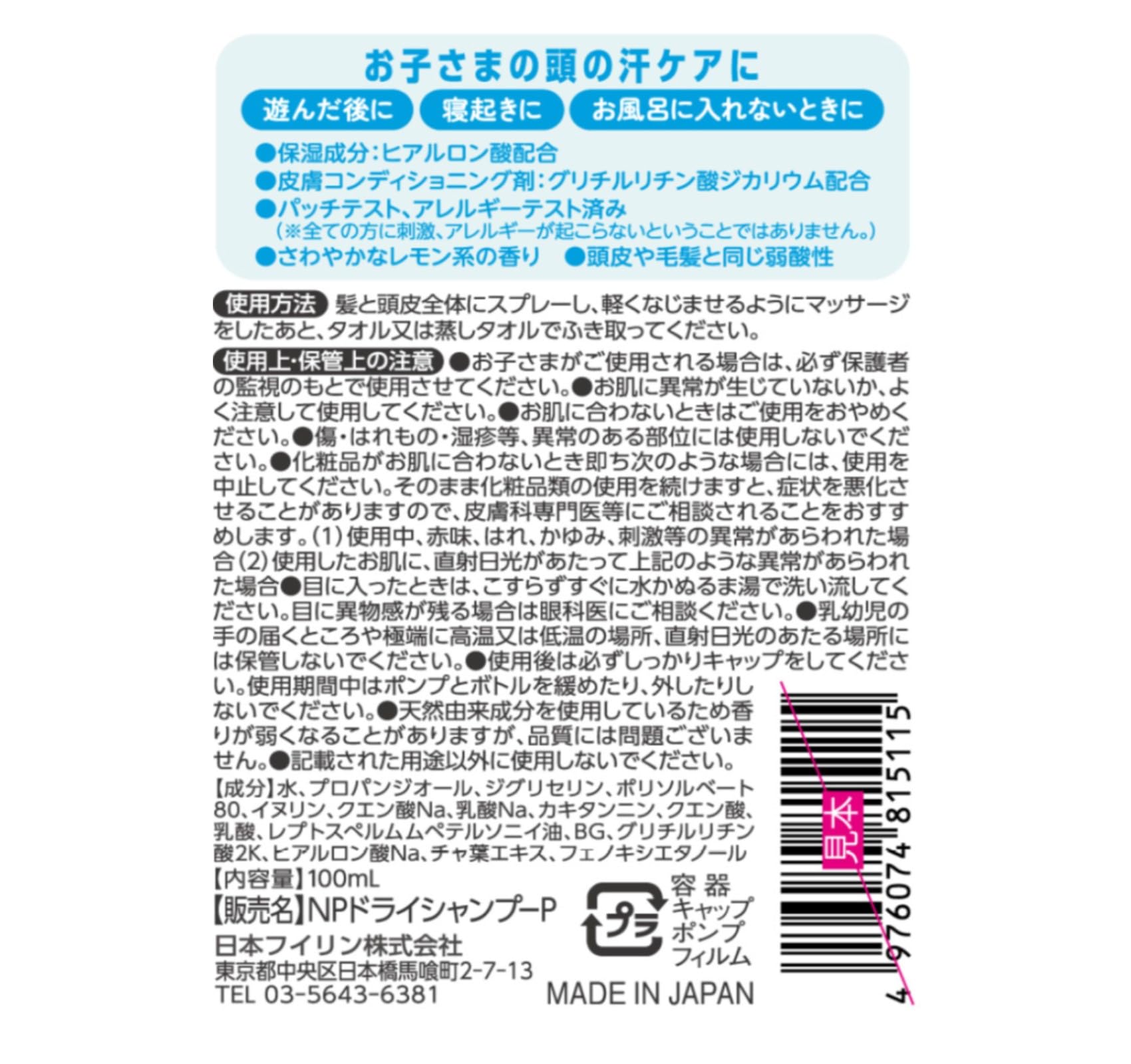 日本フイリン ドライシャンプー 水のいらないどこでもシャンプー スプレータイプ 100ml お子さまの頭に アルコールフリー。 商品紹介 ①子供にも優しいオリジナル処方 アルコール不使用+パッチテスト、アレルギーテスト合格 ②頭皮や髪のケア成分配合 保湿成分「ヒアルロン酸」+皮膚コンディショニング剤「グリチルリチン酸ジカリウム」 ③さわやかなレモン系の香り 天然精油「レモンセントティーツリー」配合 原材料・成分 水、プロパンジオール、ジグリセリン、ポリソルベート80、イヌリン、クエン酸Na、乳酸Na、カキタンニン、クエン酸、乳酸、レプトスペルムムペテルソニイ油、BG、グリチルリチン酸2K、ヒアルロン酸Na、チャ葉エキス、フェノキシエタノール 使用方法 髪と頭皮全体にスプレーし、軽くなじませるようにマッサージをしたあと、タオル又は蒸しタオルでふき取ってください。 安全警告 お子さまがご使用される場合は、必ず保護者の監視のもとで使用させてください。 お肌に異常が生じてないか、よく注意して使用してください。 お肌に合わないときはご使用をおやめください。 傷・はれもの・湿疹等、異常のある部位には使用しないでください。 化粧品がお肌に合わないとき即ち次のような場合には、使用を中止してください。 そのまま化粧品類の使用を続けますと、症状を悪化させることがありますので、皮膚科専門医等にご相談されることをおすすめします。 (1)使用中、赤味、はれ、かゆみ、刺激等の異常があらわれた場合(2)使用したお肌に、直射日光があたって上記のような異常があらわれた場合目に入ったときは、こすらずすぐに水かぬるま湯で洗い流してください。 目に異物感が残る場合は眼科医にご相談ください。 水やお湯を使わないアルコールフリーのスプレータイプ。 お子さまの頭のベタつき、ニオイ、汚れに。 さわやかなレモン系の香り。 S350-K9999