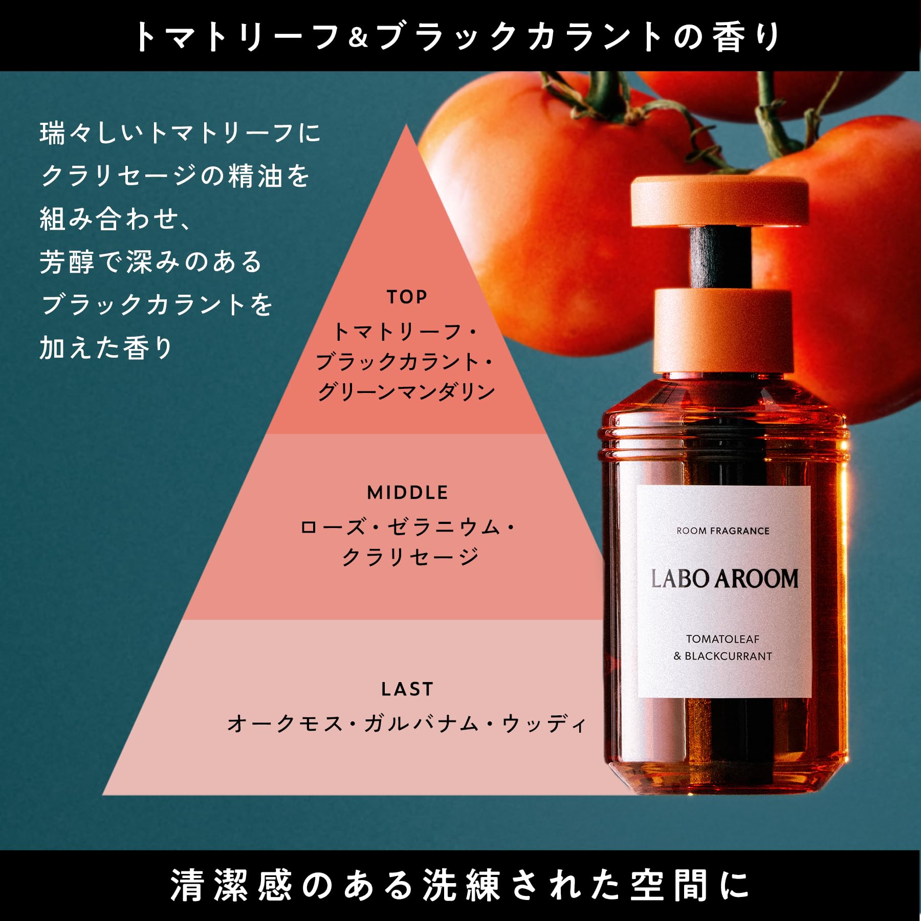 LABO AROOM ラボアルーム ルームフレグランス トマトリーフ&ブラックカラント 消臭芳香剤 寝室 玄関 リビング 155 mL。 空間と感性が調和する香りのインテリア 心地よく洗練された香りとスタイリッシュなデザインが美しく調和し、空間をくつろぎの時間で満たすように調合された、 毎日の暮らしを豊かに彩るインテリアフレグランスブランド。 気になるニオイをキャッチしていい香りに。 瑞々しいトマトリーフにクラリセージの精油を組み合わせ、芳醇で深みのあるブラックカラントを加えた香り。 清潔感のある洗練された空間に。 持続時間:約1~2か月(季節や使用状況により異なります)。 S000-K9999