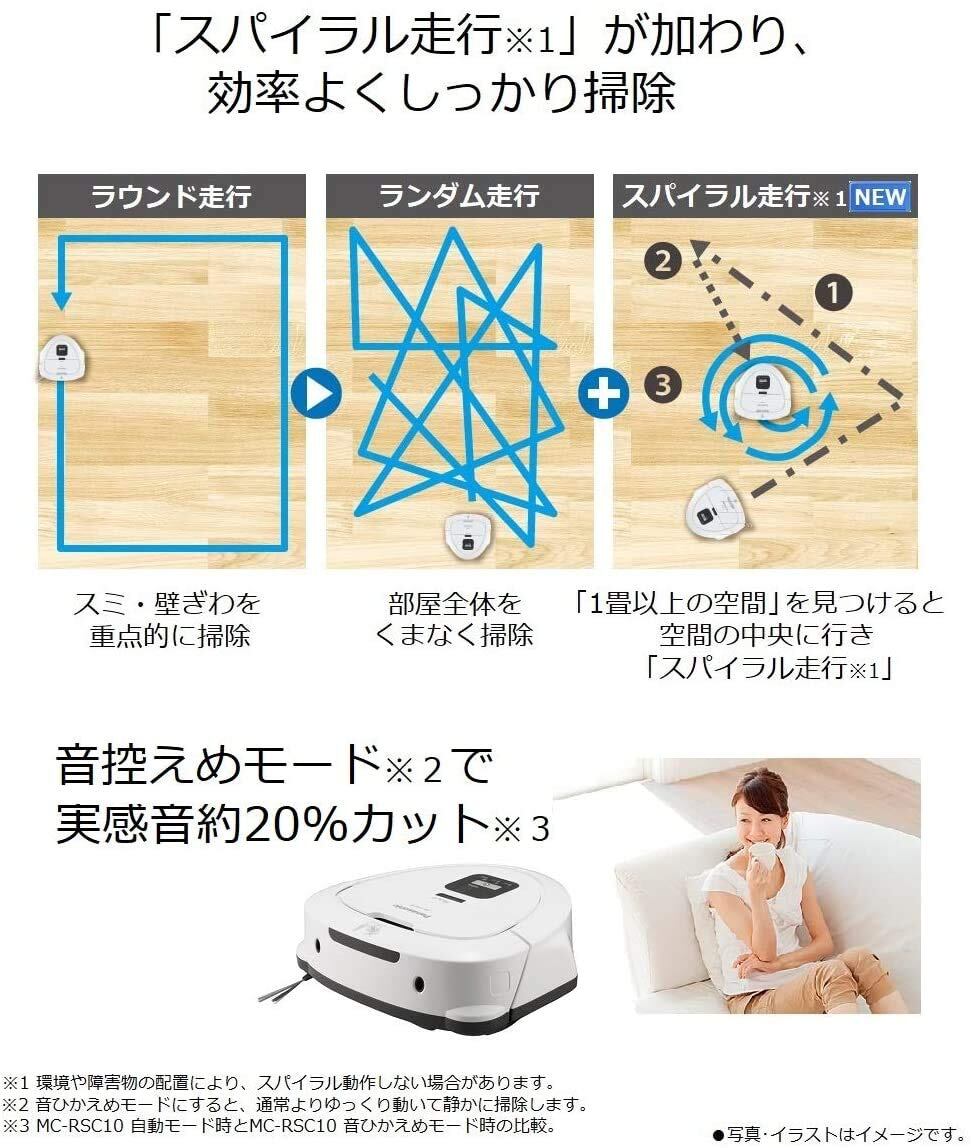 パナソニック ロボット掃除機 お掃除ロボット コードレス ルーロミニ RULOミニ ホワイト MC-RSC10-W ハードフロア対応。 ご注意(免責)>必ずお読みください 【パナソニック製品の修理に関するお問い合わせ】 パナソニック修理ご相談窓口 TEL:0120-878-554 受付時間:9:00~19:00 (日祝日及び年末年始9:00~17:30) インターネットより「パナソニック修理」で検索 商品紹介 コンパクトボディで狭い場所もラクラク。 独自の三角形状でスミ・壁ぎわもしっかり掃除 効率よく走行し、しっかり掃除 音ひかえめモード※1で、実感音 約20%カット※2 ※1音ひかえめモードにすると、通常よりゆっくり動いて静かに掃除します。 ※2MC-RSC10 自動モード時(SONE値 8.36、dB値 54.40dB)とMC-RSC10 音ひかえめモード時(SONE値 6.69、dB値 50.80dB)の比較。 ウレタン上においた0.9m×0.9mの床材上を自動モード・音ひかえめモードで走行させて、床材中心の上方1.5mで当社自主基準試験方法により測定。 騒音レベルを表す単位はdBですが、実際耳に聞こえる音の大きさとして定められた尺度が、音の感覚量SONE(ソーン)です。 本体サイズ:幅249mm×奥行249mm×高さ92mm。 消費電力:(充電中)約17W、(本体を外したとき)約0.6W。 付属品:充電台(1個),ダストボックス お手入れブラシ(1個)。 コンパクトボディで狭い場所もラクラク。 独自の三角形状でスミ・壁ぎわもしっかり掃除。 本体重量(kg):2.0。 S000-K9999