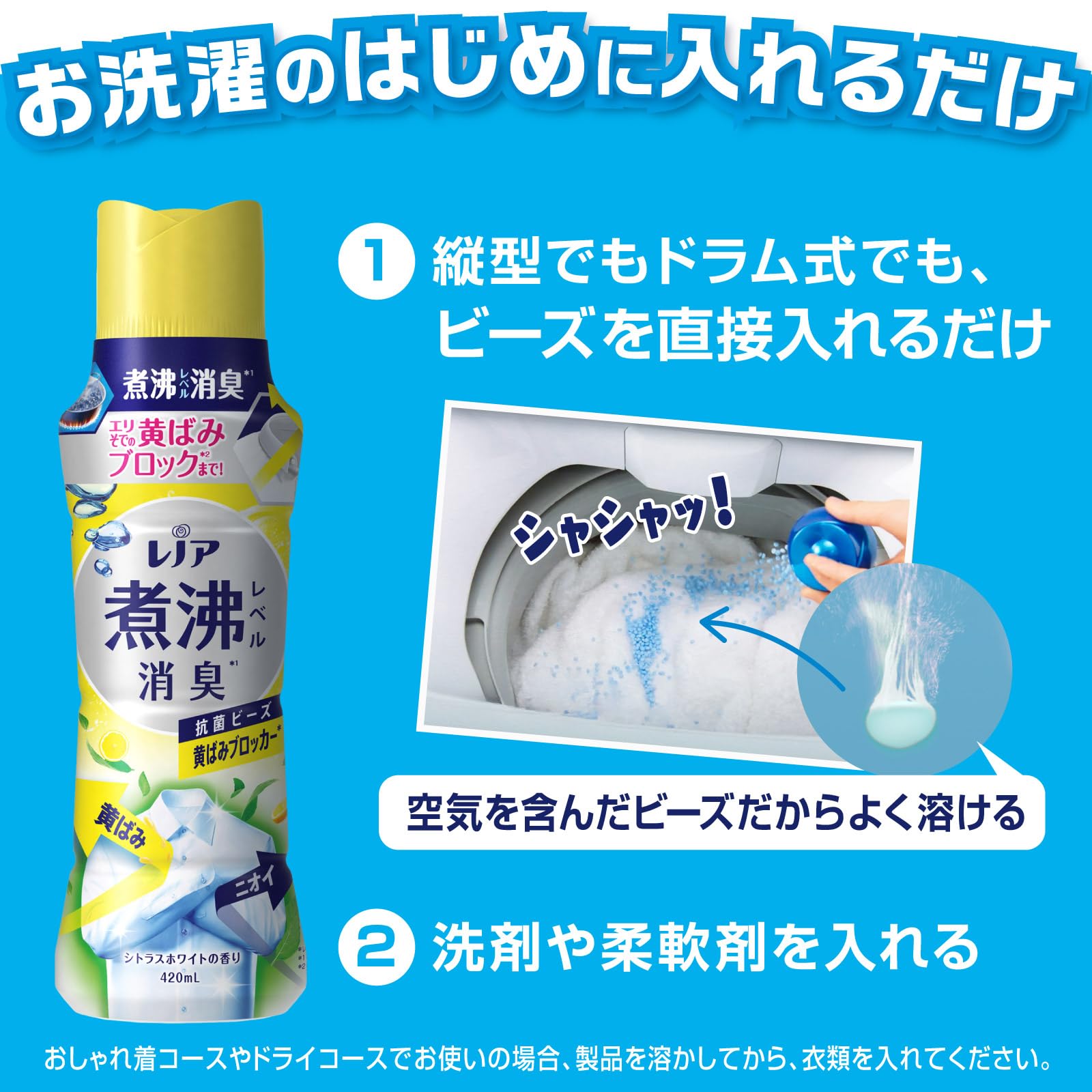 煮沸レベル消臭*1 エリそでの黄ばみブロック*2 まで! レノア 超消臭 煮沸レベル消臭 抗菌ビーズ 黄ばみブロッカー シトラスホワイト