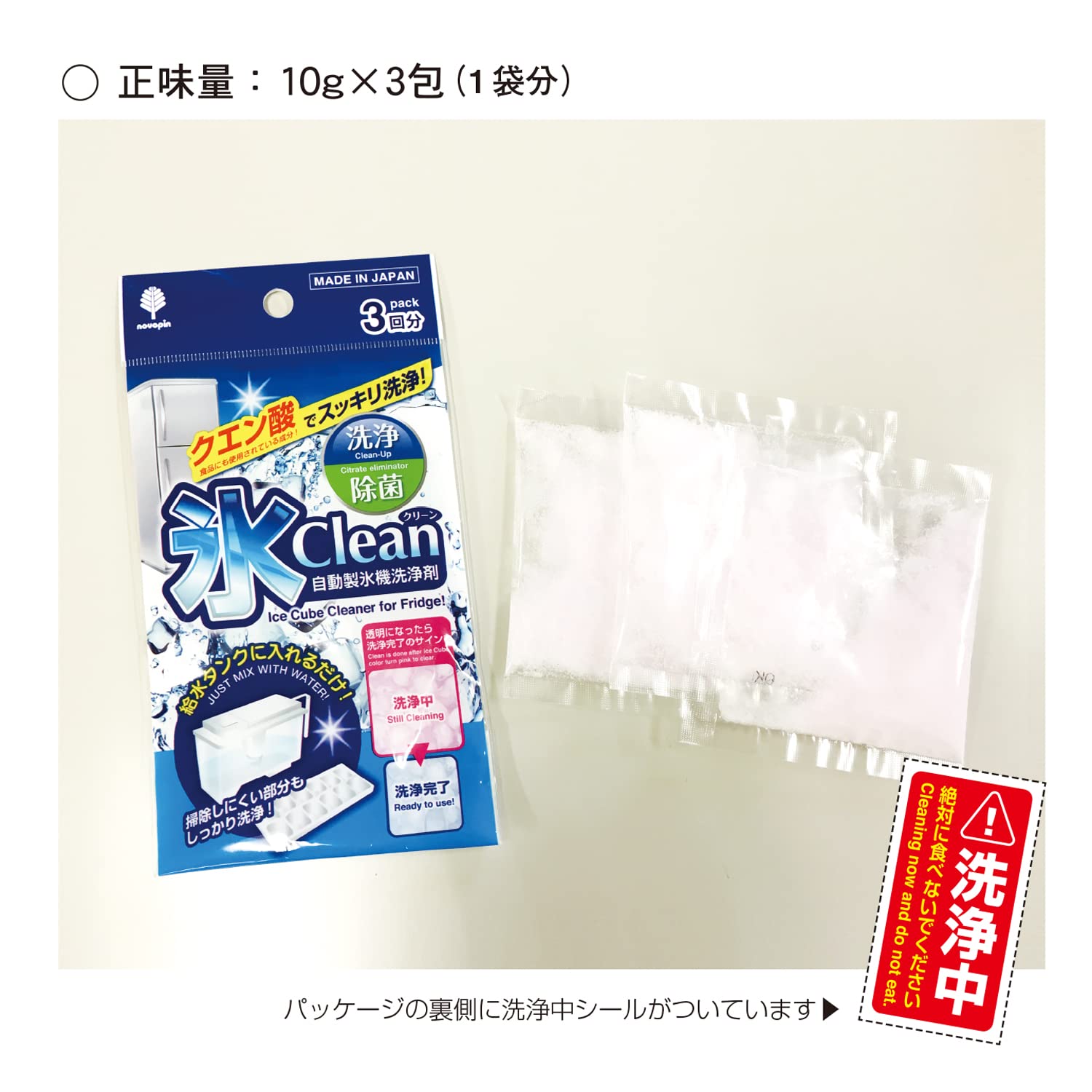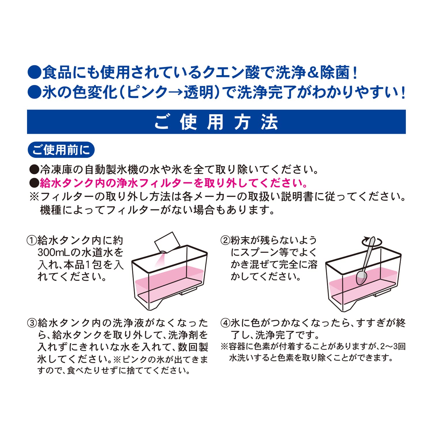 紀陽除虫菊 氷クリーン (3個セット/粉末タイプ) 製氷機洗浄 (クエン酸/除菌) 水に溶かすだけ 簡単 冷蔵庫 製氷器クリーナー。 【自動製氷機を綺麗にお掃除!】家庭用冷蔵庫の自動製氷機の洗浄剤です。 食品にも使用されているクエン酸でスッキリ洗浄&除菌*。 (*全ての菌を除菌するわけではありません) 給水タンクに水と「氷クリーン」を入れて、自動製氷機で氷を作って捨てるだけの簡単作業であっという間にできます。 【こんなときにオススメ】・冬などあまり氷を使わないときに・冷凍庫の大掃除に・氷をたくさん使う夏前~夏本番に ・冷蔵庫の内部の汚れが気になるときに。 ・自動製氷機をスッキリ洗浄して、衛生的な氷を使いたいときに。 【ご使用方法】(1)給水タンク内に約300mLの水道水を入れ、「氷クリーン」1包を入れてよく溶かしてください。 (2)給水タンクをセットし、氷を作ります。 ピンク色の氷ができますが、洗浄剤入りなので食べずに捨ててください。 ※パッケージ裏面にある「洗浄中」の表示を切り取り、目立つところに貼ってください。 (3)給水タンクの洗浄液がなくなったらきれいな水を入れて数回製氷してください。 氷に色がつかなくなったら洗浄完了です。 【使用上のご注意】・業務用の冷凍庫には使用しないでください。 ・洗浄、すすぎの際にできた氷は絶対に食べたり使用したりしないでください。 【仕様】 成分:クエン酸(果実酸)、食品添加物色素(赤色) 用途:家庭用冷蔵庫の自動製氷機の洗浄用 液性:弱酸性 正味量(1個あたり):30g(10g×3包=3回分) 数量:3個入(9回分) 使用量の目安:水道水300mLに対して1包(10g) 原産国:日本。 S000-K9999