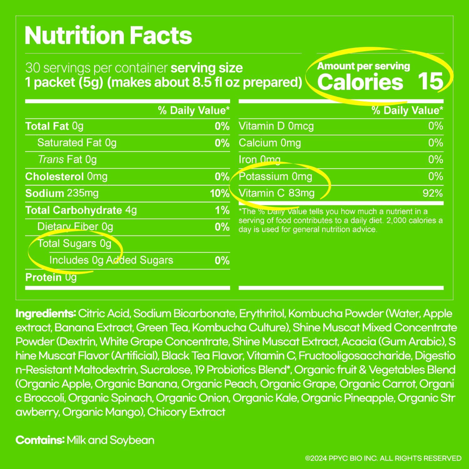 SUNMANC(サンマン) コンブチャ シャインマスカット 5g×30本 韓国緑茶 発酵コンブ茶。 商品紹介 “「美活」「腸活」に” 糖質・脂質0g、1本(5g)たったの15kcalで、美味しく健康的に摂取できます。 お子様からお年寄りまでどなたでもお飲みいただけます。 原材料・成分 エリスリトール、コンブチャ粉末、シャインマスカット混合濃縮粉末、紅茶抽出粉末、フラクトオリゴ糖、難消化性デキストリン、乳酸菌19種類混合パウダー、有機果物野菜混合粉末、チコリ抽出物/無水クエン酸、炭酸水素ナトリウム、ビタミンC、香料、スクラロース、(一部に乳成分・大豆・ももを含む) 使用方法 本製品1本(5g)を1日1回~3回、約200ml~500mlくらいの水で溶かしてお召し上がりください。 (お好みの濃さに調整してください。 ) 安全警告 直射日光、高温多湿を避けて保存してください。 幼児や子供の手が届かない場所に保管してください。 開封後はお早めにお召し上がりください。 万一、体質に合わない場合は、速やかにご使用を中止ください。 商品には万全を期しておりますが、お気づきの点などございましたらお知らせください。 本品製造工場では、卵、そば、落花生、小麦、さば、えび、豚肉、もも、クルミ、鶏肉、牛肉、いか、あわびを含む製品を製造しています。 1本(5g)あたり15kcal。 ビタミンC107mg含有。 糖質、脂質0g。 乳酸菌19種含有。 有機成分12種含有。 S000-K9999