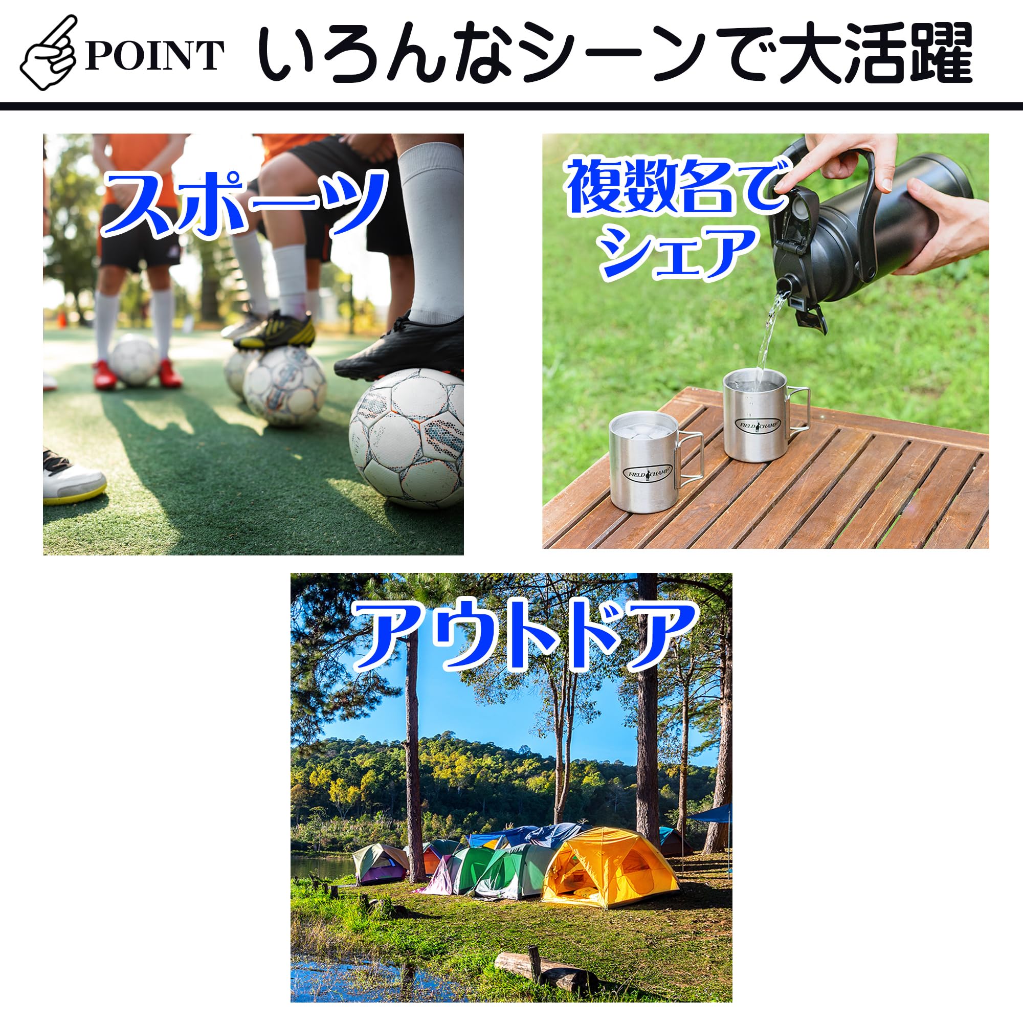 フィールドチャンプ 真空保冷 ステンレスジャグ ステンレスボトル 2L 2リットル 大容量 ワンタッチ 直飲み ハンドル付き お手入れラクラク スポーツボトル 水筒【 カーキ 】 107-202。 大容量2L!真空二重構造の優れた保冷力を持つステンレスジャグ。 冷たさを長持ちして最後まで美味しい温度をキープします。 飲みたい時にすぐに水分補給できる直飲みタイプ。 スポーツや部活、アウトドアシーンにぴったりです!※保冷専用 広々口径約7cmで大きい氷をそのままたっぷり入れられ、さらに冷たさキープ! 底までしっかり洗えてお手入れもラクラクです。 移動時に便利な握りやすいハンドル付き!。 大容量2L!真空二重構造の優れた保冷力を持つステンレスジャグ。 冷たさを長持ちして最後まで美味しい温度をキープします。 飲みたい時にすぐに水分補給できる直飲みタイプ。 スポーツや部活、アウトドアシーンにぴったりです!。 広々口径約7cmで大きい氷をそのままたっぷり入れられ、さらに冷たさキープ!底までしっかり洗えてお手入れもラクラクです。 移動時に便利な握りやすいハンドル付き!。 本体サイズ:W148×D138×H316mm 本体重量:約855g。 保冷効果:7度以下(6時間)※保冷専用商品です 容量:2L。 素材・材質︰本体/ステンレス鋼 蓋/ポリプロピレン 開閉ボタン/ABS樹脂 ロックカバー/TPE樹脂 パッキン/シリコーンゴム ハンドル/ポリプロピレン、TPE樹脂。 S000-K9999