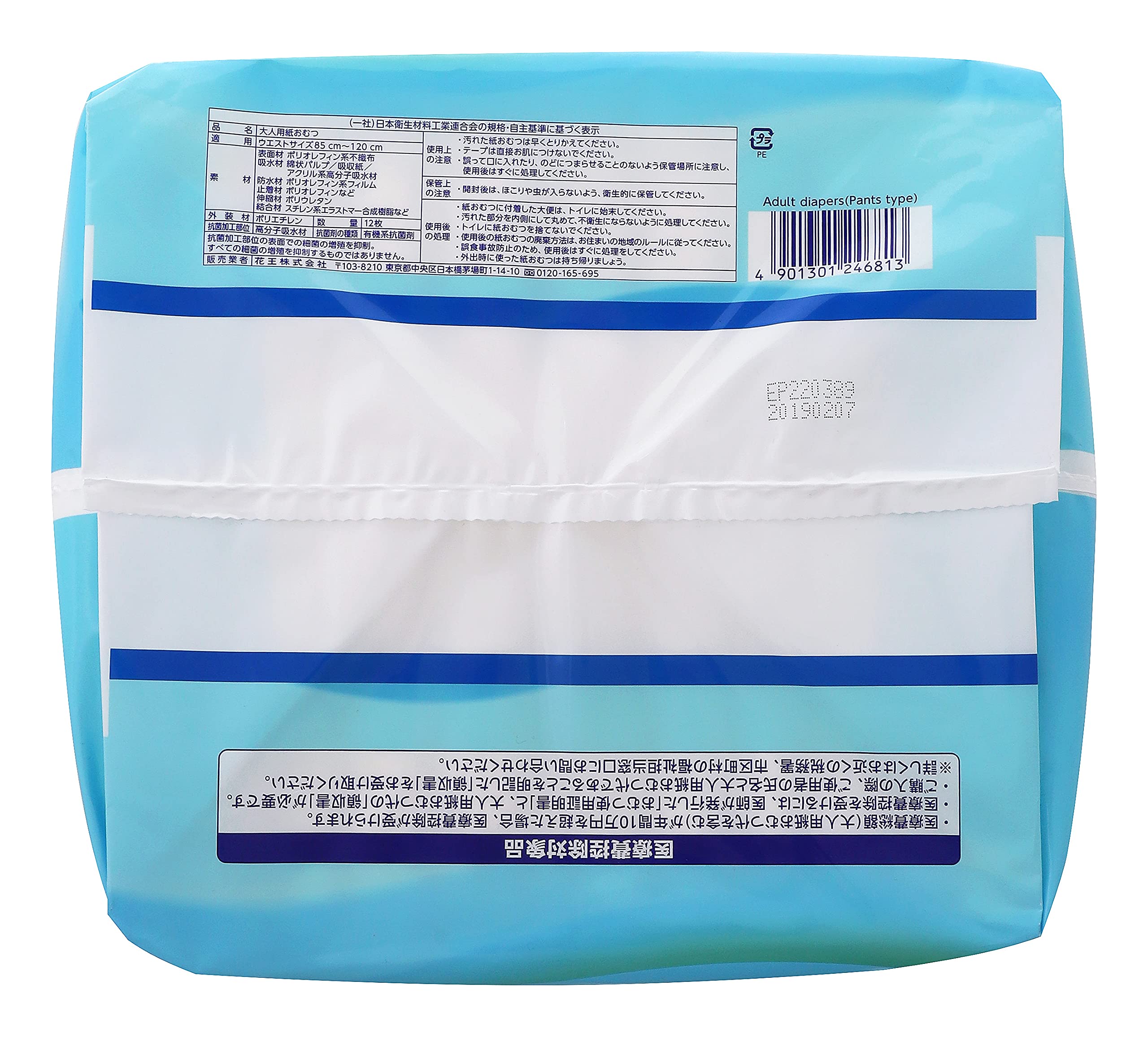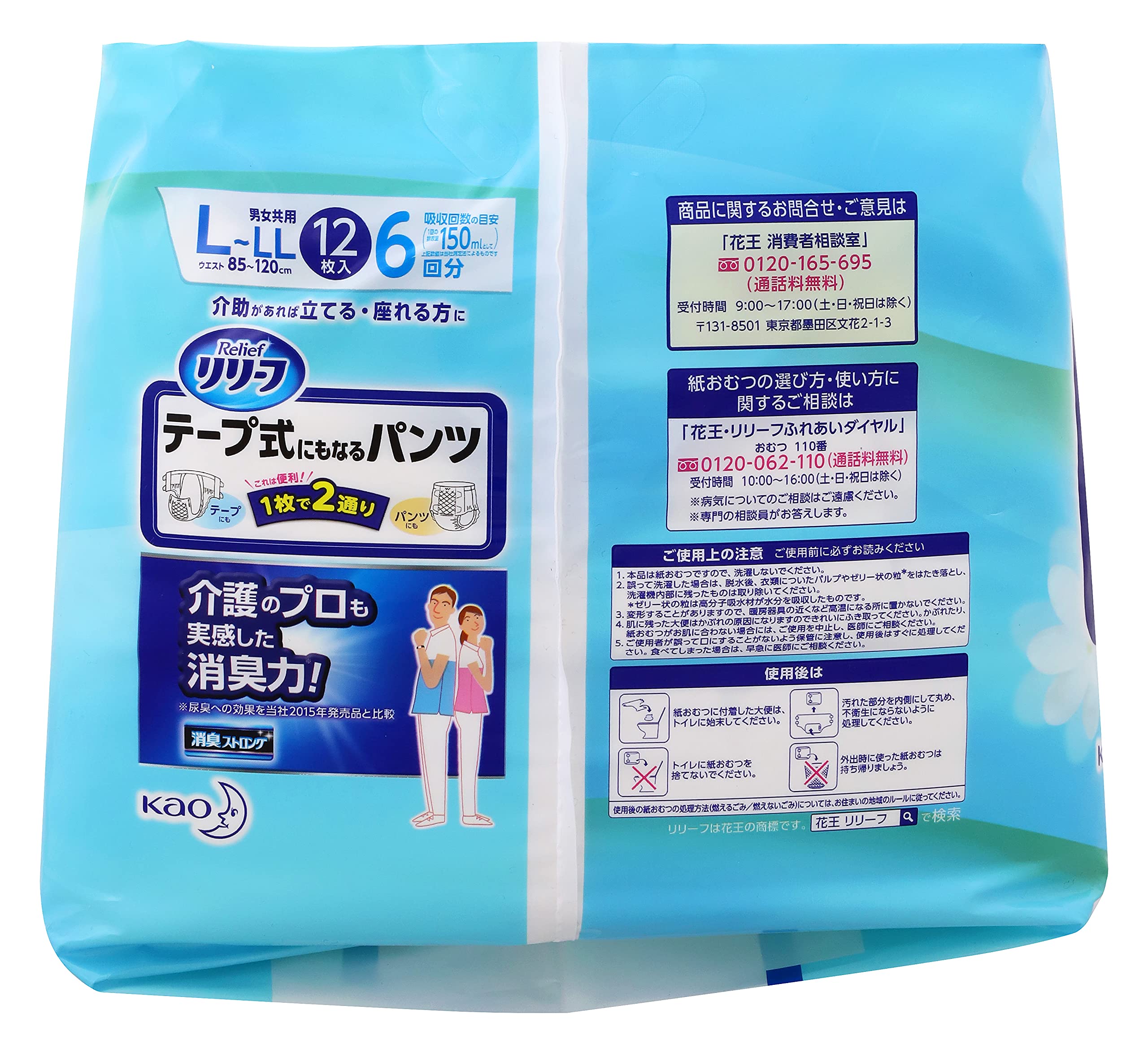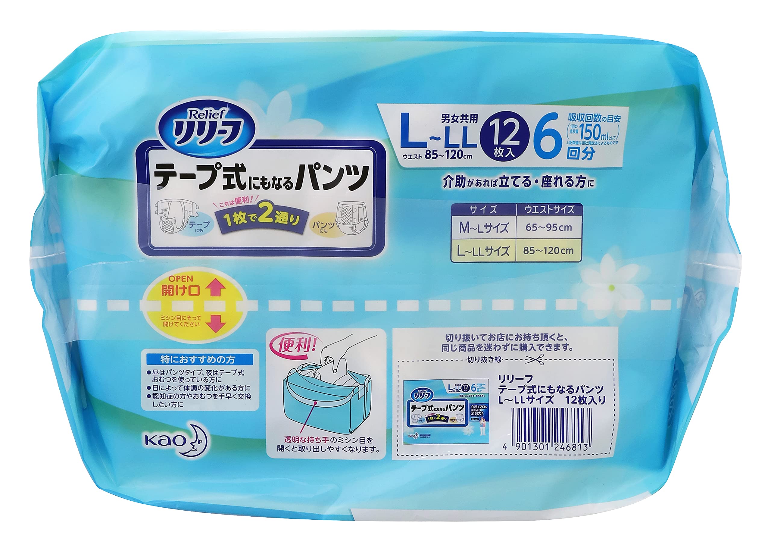 リリーフ 花王(Kao) テープ 式にもなるパンツ L~LL 12枚【ADL区分:立てる・座れる方】。 商品紹介 寝たまま交換ができる、テープ式にもなるパンツタイプ。 1枚で2通りの機能を兼ね備えているので、体調の不安定な方や、テープ式は、まだ、はきたくないという前向きな気持ちに応えたパンツです。 パンツのミシン目を切り離すとテープ式に、テープでつけるとパンツタイプになります。 何度でも取り外し可能です。 (安心のおしっこ約6回分吸収)(医療費控除対象品) 『お悩み解決シリーズ』(要介護向け) 『お悩み解決シリーズ』(要介護向け)「モレや肌トラブル」はおむつの2大悩み。 しっかりケアできるモノを選んでもらえるように、「2WAY機能」「吸水ギャザー」など独自のモレ防止機能、「さらさら通気性」「Ag抗菌」「やわらか不織布」など肌への負担軽減を追求した機能を採用しています。 使用上の注意 1.本品は紙おむつですので、洗濯しないでください。 2.誤って洗濯した場合は、脱水後、衣類についたパルプやゼリー状の粒*をはたき落とし、洗濯機内部に残ったものは取り除いてください。 *ゼリー状の粒は高分子吸水材が水分を吸収したものです。 3.変形することがありますので、暖房器具の近くなど高温になる所に置かないでください。 4.肌に残った大便はかぶれの原因になりますのできれいにふき取ってください。 かぶれたり、紙おむつがお肌に合わない場合には、ご使用を中止し、医師にご相談ください。 5.ご使用者が誤って口にすることがないよう保管に注意し、使用後はすぐに処理してください。 食べてしまった場合は、早急に医師にご相談ください。 [応急処置] 口の中に残っているもの、のどに詰まっているものがあれば、すぐに取り出してください。 窒息のおそれがあります。 詰まっているものが取り出せない場合は、すぐに医師の診察を受けてください。 すでに飲み込んでしまった場合は、消化されずにそのまま排泄されますので、特に処置の必要はありません。 多量に食べてしまった場合、具合が悪くなった場合は、すぐに製品を持参して医師に相談してください。 商品に関するお問合せ・ご意見は「花王消費者相談室」0120-165-695 受付時間:9:00~17:00(土・日・祝日は除く)。 商品サイズ (幅X奥行X高さ) : 28×26.5×19.5。 質量 : 1323g。 ウエスト(約):85~120cm。 12枚入り。 S000-K9999