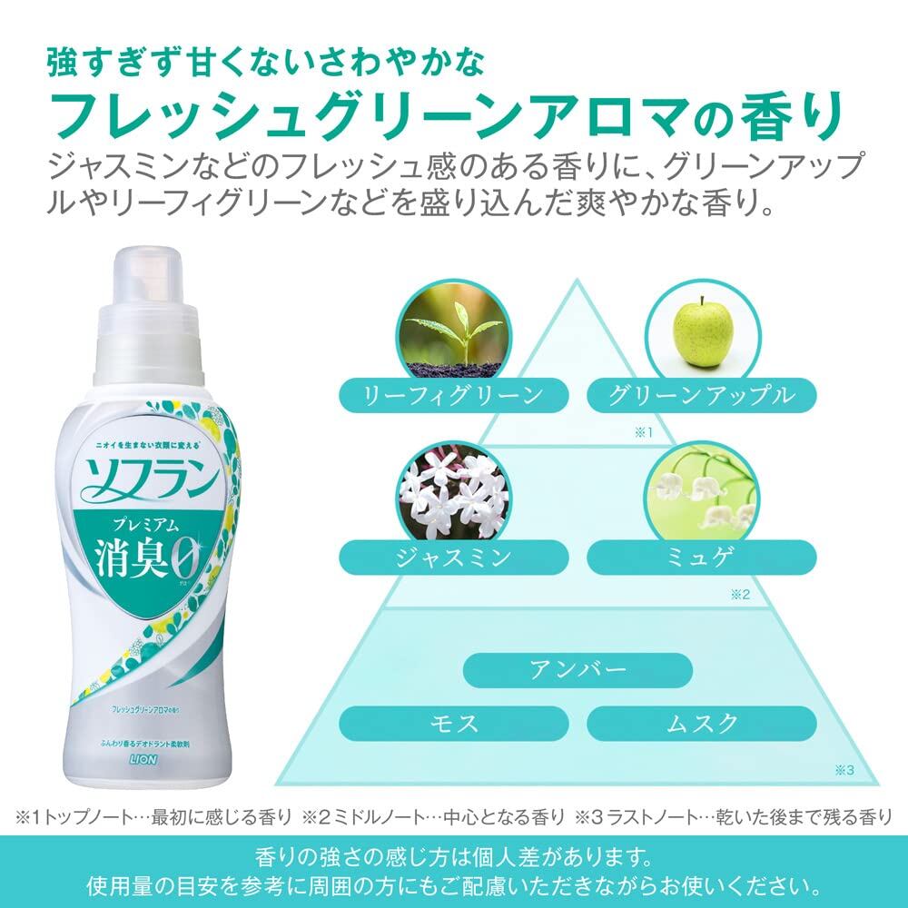 【大容量】ソフラン プレミアム消臭 フレッシュグリーンアロマの香り 液体 柔軟剤 詰め替え ウルトラジャンボ 1680ml×2個セット。 商品紹介 商品紹介 【進化した防臭力! ニオイを生まない衣類に変える柔軟剤】繊維の奥深くまで極小消臭成分が入り込んで吸着する「3D深層コーティング」で、夜までニオイを生まない衣類に変える。 汗臭・体臭・生乾き臭・加齢臭、帰宅時の靴下臭さえ、夜までニオイを発生させない。 「部屋干し抗菌効果」で、部屋干し時のイヤなニオイの発生を抑える。 「静電気防止効果」で、花粉付着も防ぐ。 「速乾」*柔軟剤未使用時との比較(部屋干し条件下)衣類のタバコのニオイ付着を防ぐ。 植物生まれの柔軟成分が、センイの1本1本まで柔らかく仕上げる。 (赤ちゃんの衣類にも使えます)強すぎず甘くない、ナチュラルな香りが続く4つのラインアップ(フローラルアロマ/アロマソープ/ホワイトハーブアロマ/フレッシュグリーンアロマ) 原材料・成分 界面活性剤(エステル型ジアルキルアンモニウム塩)、安定化剤、香料、消臭剤 原材料・成分 界面活性剤(エステル型ジアルキルアンモニウム塩)、安定化剤、香料、消臭剤 使用方法 洗濯機のすすぎ用コンパートメントに適量を入れてください。 洗濯物の量に応じて適量を調整してください。 原産国:日本。 香り:強すぎず甘くない、ナチュラルな香りが続くフレッシュグリーンアロマ。 植物生まれの柔軟成分が、センイの1本1本まで柔らかく仕上げる。 「部屋干し抗菌効果」で、部屋干し時のイヤなニオイの発生を抑える。 「静電気防止効果」で、花粉付着も防ぐ。 S000-K9999