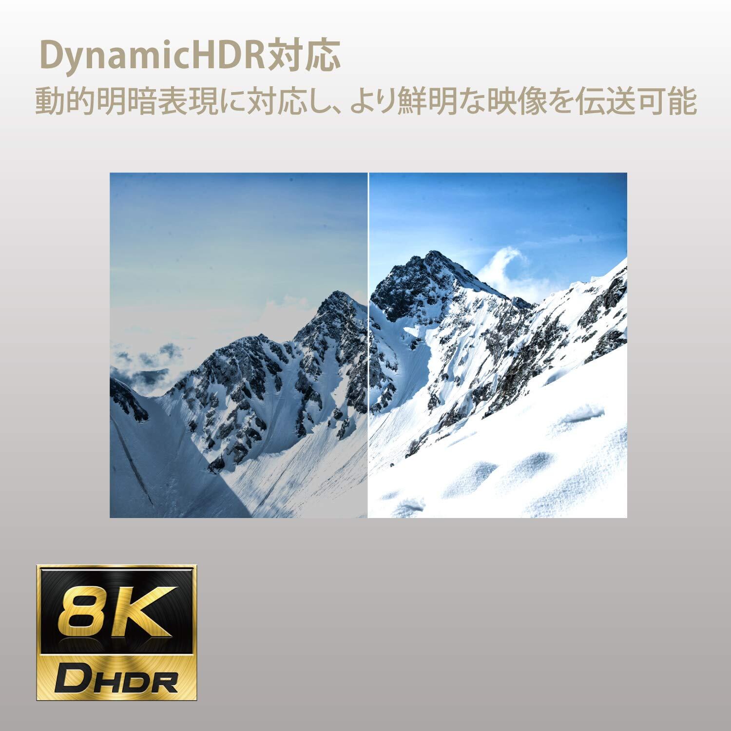 エレコム HDMI 2.1 ケーブル ウルトラハイスピード 3m 【Ultra High Speed HDMI Cable認証品】 8K(60Hz) 4K(120Hz) 48Gbps 超高速 【 PS5 / PS4 Nintendo Switch 対応】 7680×4320 eARC VRR 黒 ブラック。 48Gbpsの高速伝送による8K映像の伝送に対応し、高い信頼性と機能性、ノイズ耐性を兼ね備えたイーサネット対応ウルトラハイスピードHDMIケーブルです。 8K/4K/2Kに対応し、超高解像度かつ更になめらかな映像の伝送が可能なUltra High Speed HDMI(R) Cable規格認証済ケーブルです。 従来のHDR10に比べ、フレームごとにより広い明暗差、色域、コントラストを伝送することができるDolby Vision(R)に対応しています。 映像フレームごとに適切な明るさとコントラストを適用する動的明暗表現に対応し、より鮮明な映像を伝送可能にするDynamicHDRに対応しています。 著作権保護技術のHDCP2.3、HDCP2.2、HDCP1.4に対応しています。 従来のBT.709に比べ、より広い色域をカバーしたBT.2020映像の伝送が可能です。 eARC対応により、高ビットレート(192kHz 24-bit)と、非圧縮の5.1chと7.1ch音声に対応した迫力あるオブジェクトベースオーディオを再生可能です。 ゲームモードVRRに対応することで、可変リフレッシュレートにより、PC等の機器とディスプレイの間で起こるタイムラグやカクつきを最小限に抑え、滑らかな映像伝送を行います。 1本のケーブルで、映像信号と音声信号をデジタルのままで高速伝送するだけでなく、イーサネット信号の双方向通信を実現します。 100Mbpsのイーサネット通信を実現する、HEC(HDMIイーサネットチャンネル)に対応しています。 S000-K9999