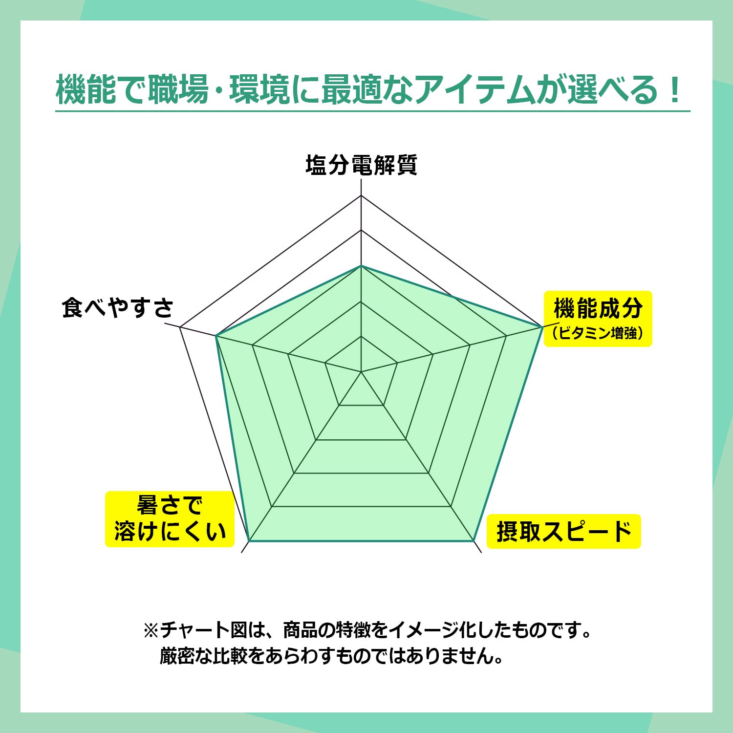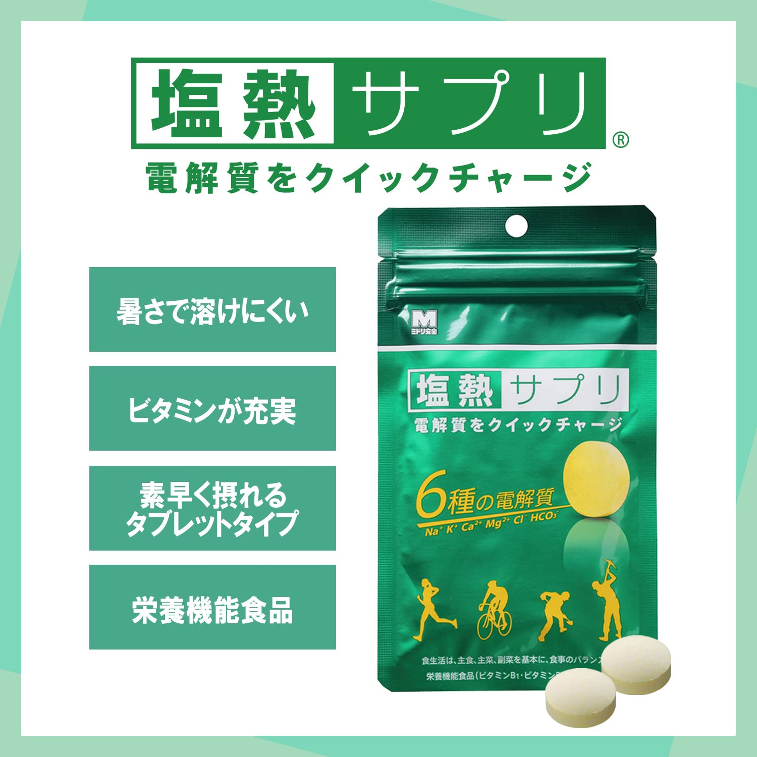 ミドリ安全 塩熱サプリ 電解質をクイックチャージ 乾いたカラダに塩分補給 レモン 30g (約24粒入/個包装なし) 1袋。 商品の説明 [配合栄養素(100gあたり)] ナトリウム:3.2g(食塩相当量8g分相当)、カルシウム73.3mg(かたくちいわし・生 15.3本分相当)、カリウム:520mg(えんどう・全粒 100粒分相当)、ビタミンC:320mg(いちご 74粒分相当)、クエン酸:レモン1~2個分相当、重炭酸:107mg、塩化物:4.4g、ビタミンB1:4.8mg(豚・ロース 700g分相当)、マグネシウム:33.3mg(らっかせい・乾 21.8個分相当)、ナイアシン:52mg(鶏・ササミ 440g分相当)、ビタミンB2:5.6mg(納豆20パック分相当)、ビタミンB6:4mg(ピスタチオ 328粒分相当) [1日当たりの摂取目安量と摂取の方法] 1日当たり6粒を目安に、飲み込まずに噛み砕いてお召し上がりください。 水分補給のタイミングで水やお茶約100mL(紙コップ1杯程度)に対して1粒がおすすめです。 [摂取する上での注意事項] 本品は、多量摂取により疾病が治癒したり、より健康が増進するものではありません。 1日の摂取目安量を守ってください。 本品は、特定保健用食品と異なり、消費者庁長官による個別審査を受けたものではありません。 [注意] 本品は卵、乳を含む製品と共通の設備で製造しております。 粒が大きいので、のどに詰まらせないようにご注意ください。 歯の弱い方は、歯を折らないようにご注意ください。 本品は一般のサプリメントより、ナトリウム、カリウム等の電解質濃度が高くなっており、塩分の摂取制限をされている方、腎疾患の方、乳幼児の方等は、お召し上がりにならないで下さい。 本品は吸湿しやすいため開封後は賞味期限に関わらずお早めにお召し上がりください。 保存状況によっては色が変わる場合がありますが、品質には問題ありません。 本品に含まれるビタミンB2の影響で尿が黄色くなることがあります。 まれに空袋が混入する場合がございますが、内容量(正味量)には変わりありませんのでご容赦ください。 使用上の注意 [注意] 本品は卵、乳を含む製品と共通の設備で製造しております。 粒が大きいので、のどに詰まらせないようにご注意ください。 歯の弱い方は、歯を折らないようにご注意ください。 本品は一般のサプリメントより、ナトリウム、カリウム等の電解質濃度が高くなっており、塩分の摂取制限をされている方、腎疾患の方、乳幼児の方等は、お召し上がりにならないで下さい。 本品は吸湿しやすいため開封後は賞味期限に関わらずお早めにお召し上がりください。 保存状況によっては色が変わる場合がありますが、品質には問題ありません。 本品に含まれるビタミンB2の影響で尿が黄色くなることがあります。 まれに空袋が混入する場合がございますが、内容量(正味量)には変わりありませんのでご容赦ください。 原材料・成分 [原材料] ブドウ糖、麦芽糖、食塩、でんぷん/グリセリンエステル、クエン酸ナトリウム、クエン酸、塩化カリウム、香料、ビタミンC、乳酸カルシウム、硫酸マグネシウム、甘味料(ステビア、スクラロース)、重炭酸ナトリウム、ナイアシン、パントテン酸カルシウム、ビタミンB6、ビタミンB1、ビタミンB2。 栄養機能食品。 [重量] 30g(約24粒)/1袋あたり ※摂取方法:サクッ、サクッと噛んで、水(100ml程度)と一緒にお召し上がりください。 [特長] 6種の主要電解質に多種の栄養素をハイバランスで配合。 しかも瞬時に補給するタブレットタイプ 厳しい熱職場や夏の炎天下で働く人々に失った電解質や各種ビタミンを補給 爽やかなレモン風味。 [注意点] ※商品のデザイン、仕様、価格等は予告なく変更になる場合がございます。 S000-K9999