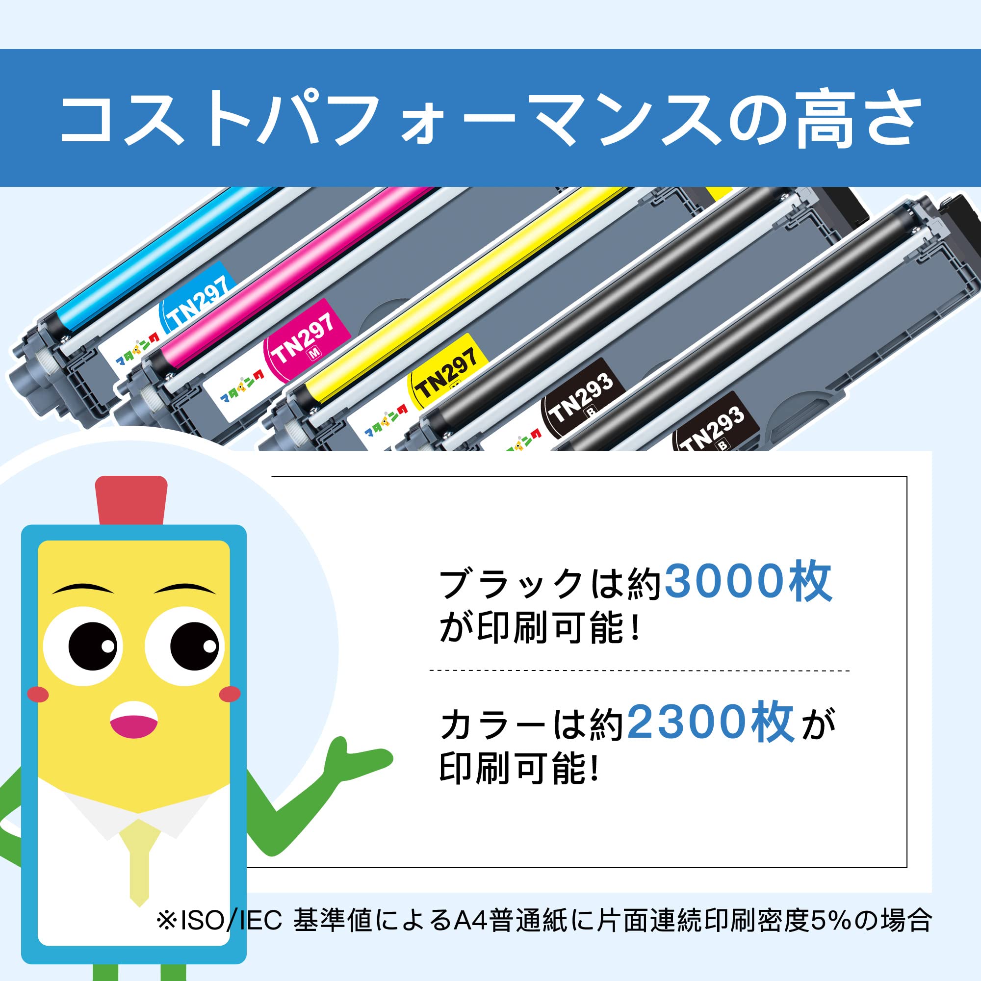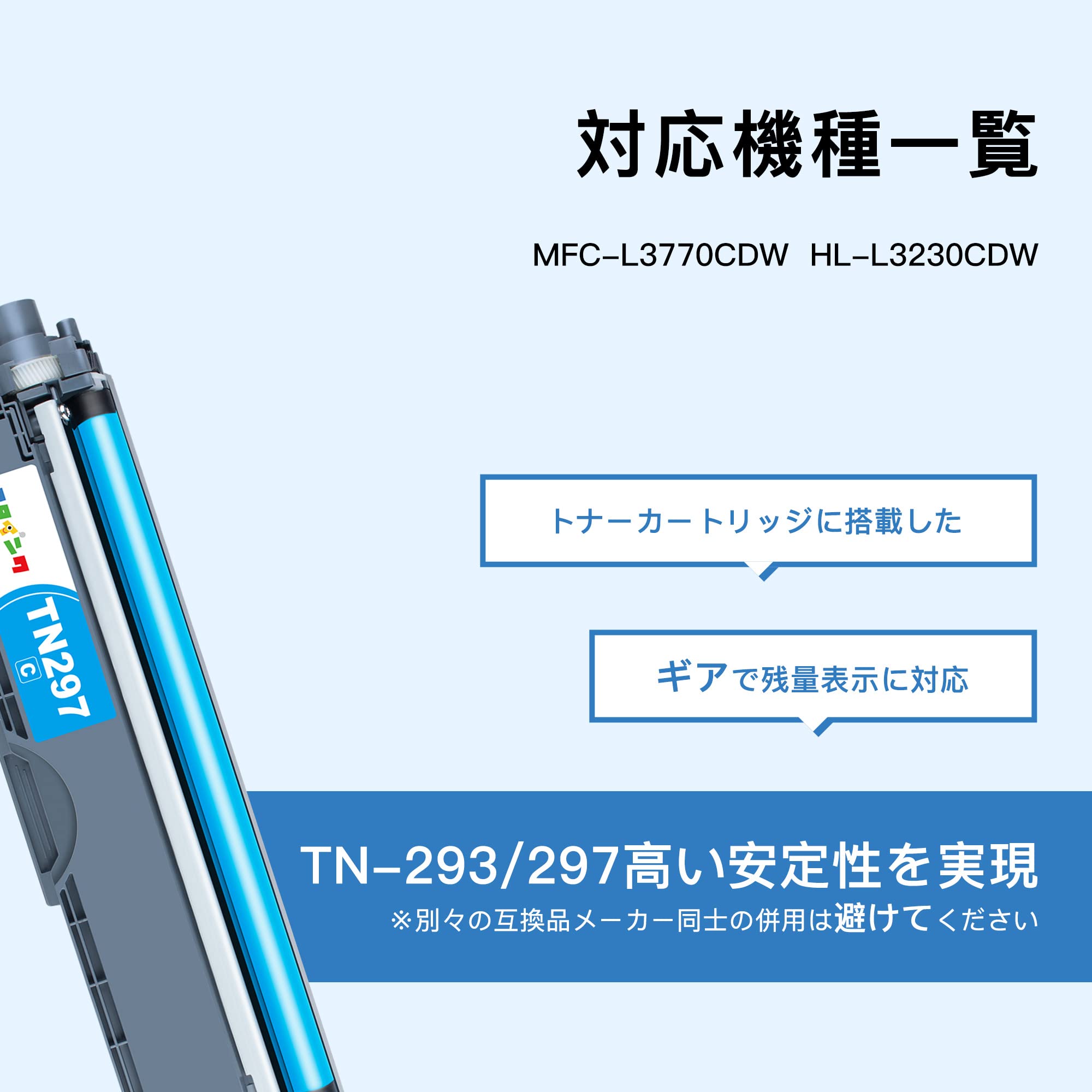 マタインク TN-293/297 互換トナーカートリッジ ブラザー(Brother)用 TN-293 TN-297 大容量 5本セット 残量表示 個別包装 純正併用可能 TN-293BK TN297 トナー 対応機種:MFC-L3770CDW HL-L3230CDW。 【セット内容】マタインク ブラザー(Brother)対応 TN-293/297 トナーカートリッジ 4色セット+TN293BK 合計5本セット。 弊店のTN293 TN297には高品質トナーパウダーを採用して、本品は互換トナーカートリッジです、純正品ではありません。 【印刷枚数】お得な大容量セット!ブラックは TN-293BK 約3000枚が印刷可能、カラー TN-297C TN297M TN297Y は約2300枚印刷可能。 【対応機種】MFC-L3770CDW HL-L3230CDW と互換性のある。 【注意事項】本製品は純正品ではありません。 純正品との併用は問題ありませんが、別々の互換品メーカー同士の併用は避けてください。 S600-K9999