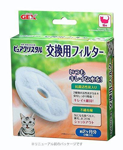 ジェックス ピュアクリスタル 交換用フィルター 猫用 2個入。 商品紹介 ピュアクリスタル猫用専用軟水化フィルター。 下部尿路の健康維持に。 フィルターで食べかす、被毛、ホコリを除去できるので、いつもたくさんキレイな水を与えられます。 不織布層で気になる食べカス、被毛、ホコリをシャットアウト!抗菌活性炭入り。 2種類の活性炭がカル臭をしっかり吸着、キレイを維持!取り替えも簡単。 フィルター2個入りで約2ヶ月間ご使用いただけます。 原材料・成分 不織布、活性炭 他 使用方法 ピュアクリスタル全猫用またはピュアクリスタル複数飼育猫用にセットしてご使用ください。 フィルター交換の目安は1か月に1回程度です。 本体サイズ (幅X奥行X高さ) :15×15×1.5cm。 本体重量:30g。 S000-K9999