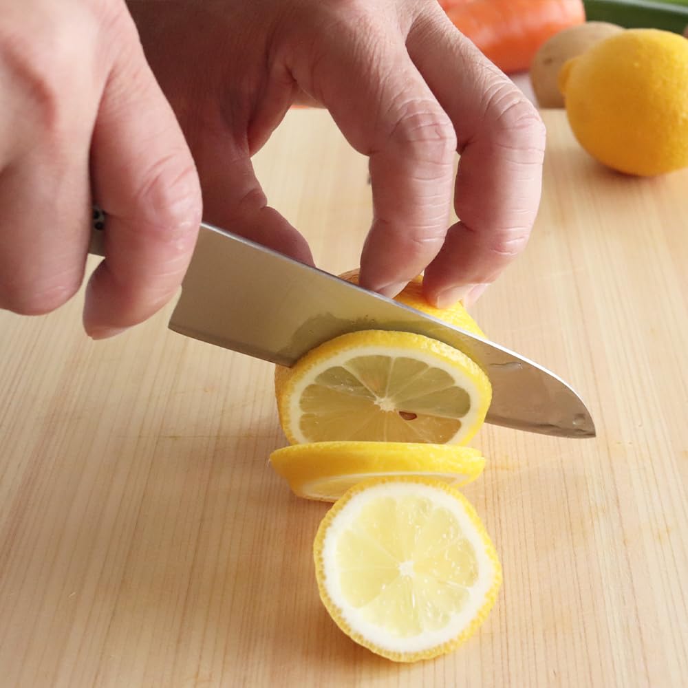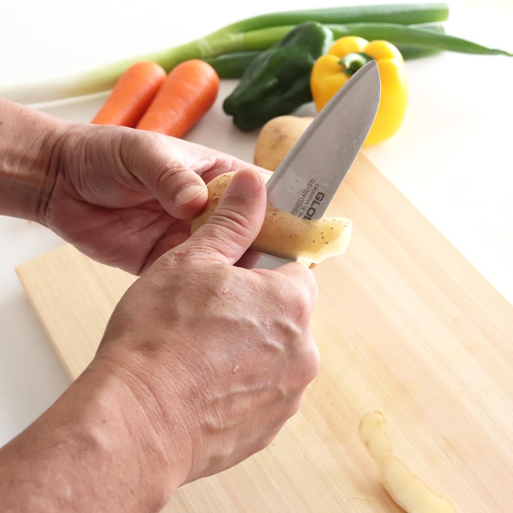 グローバル 三徳包丁 両刃 刃渡り 12cm GS-109。 両刃(右利き・左利き兼用)、刀身 / 刃物用ステンレス(モリブデン・バナジウム入)、柄 / 18-8ステンレス。 全長24cm 、刃渡り12cm 、刃幅3.5cm、重量95g。 ※刃の持続性を維持する為、まな板に置いてカットする際は、木製や柔らかいプラスチック製のまな板をご使用ください。 ※繊細な刃付けのため、硬い食材(かぼちゃ、とうもろこし、乾燥した餅、骨など)へのご使用は避けてください。 ※食器洗い乾燥機はサビの原因になるため使用しないでください。 S000-K9999