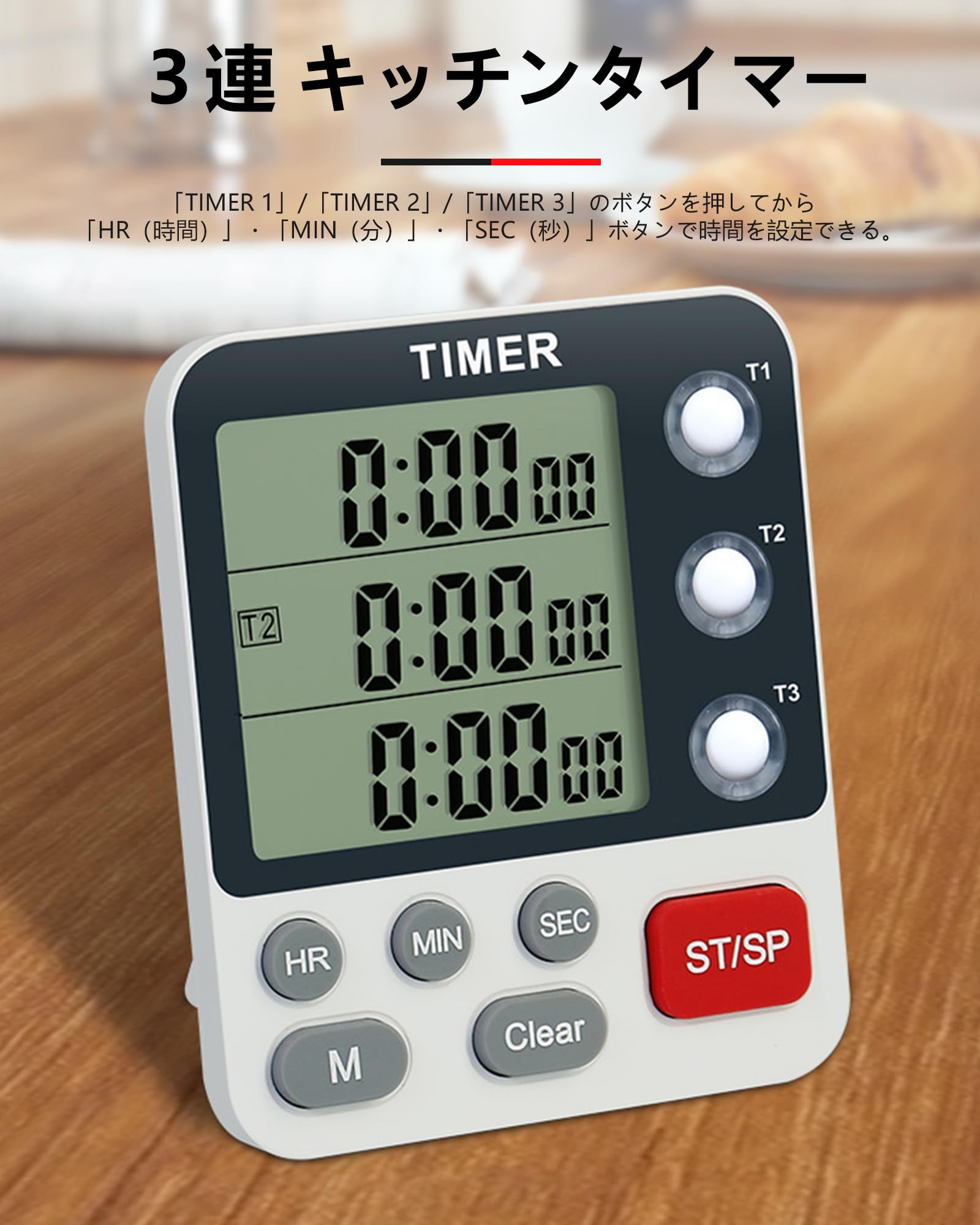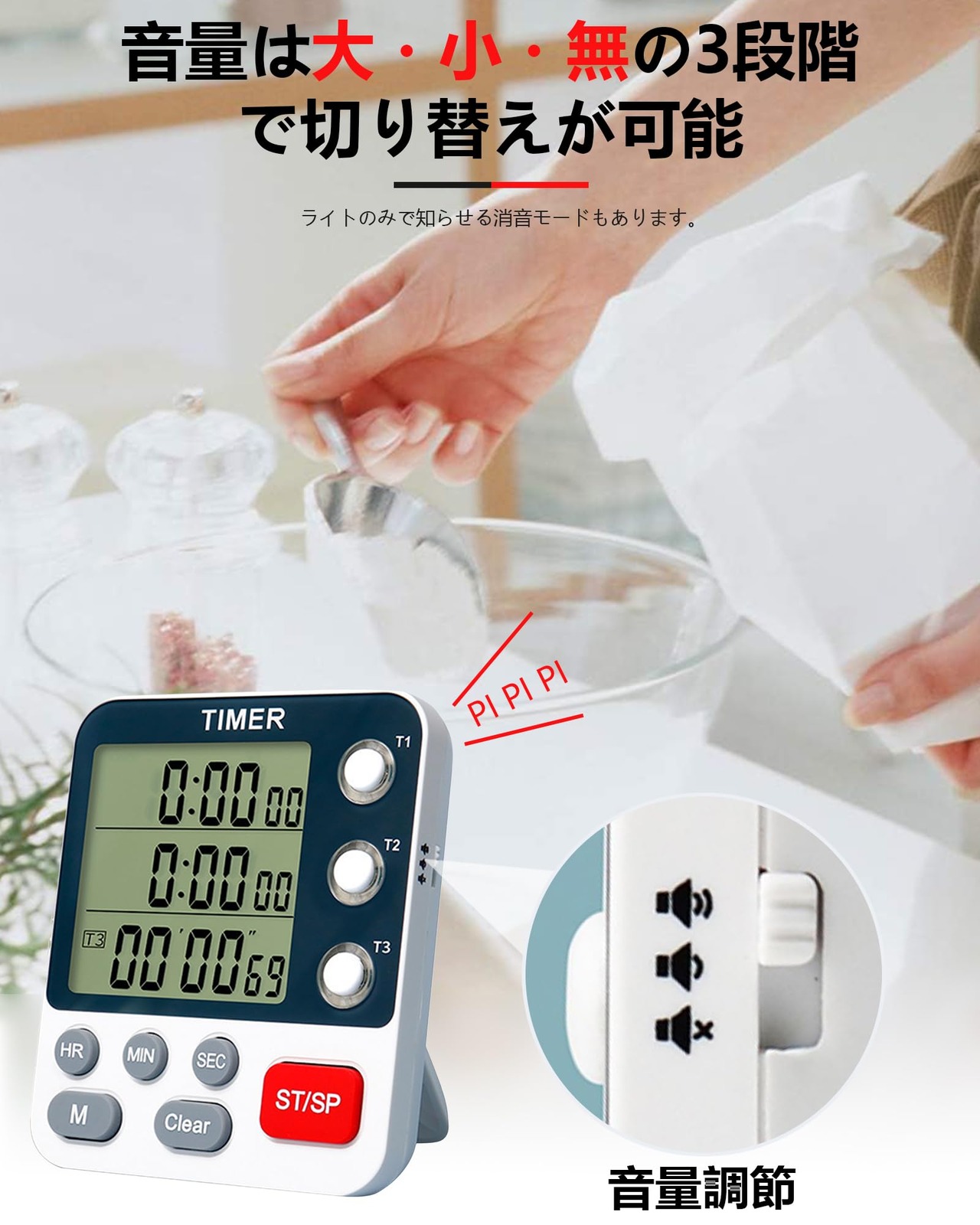 タイマー 3連 キッチンタイマー 大画面 99時間 カウントアップ/ダウンタイマー 勉強タイマー 3段階音量調整可能 マグネット付き 卓上置き 壁掛け 多機能タイマー プレゼント。 【多機能タイマー】カウントダウンに加え、経過時間が計れるカウントアップ機能や、同じ時間を繰り返し計るときに便利なリピート機能を搭載。 最大99時間59分59秒設定可能。 メモリー機能設計で、設定を繰り返す必要がなく、時間を効率的に管理できます。 【タイマー機能】「TIMER 1」/「TIMER 2」/「TIMER 3」のボタンを押してから「HR(時間)」・「MIN(分)」・「SEC(秒)」ボタンで時間を設定できる。 3つのモードを自由に切り替えることができます。 別売りの単4電池2本が必要です。 【3つ置き方】タイマーはグネット・フック・スタンドの3WAY仕様で、シーンに合わせて使えるのもおすすめのポイントです。 シンプルなデザイン、コンパクトサイズで収納に便利。 【音量調節可能】音量は大・小・無の3段階で切り替えが可能。 図書館や自習室、深夜の勉強など音を鳴らしたくない場合は、ライトのみで知らせる消音モードもあります。 【超大型LED表示】縦9.5cm・横8cm・厚さ(奥行き)2.1cm のコンパクトな3連 キッチンタイマー 。 遠くても画面から正確にはっきり数字を見えます、お年寄りや子供にも使いやすいです。 勉強/仕事/料理/睡眠/スポーツ/日常生活に欠かせない家電です。 S000-K9999