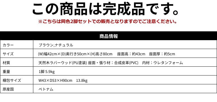 ダイニングチェア チェアー 天然木 北欧 2脚セット チェア軽量化と取っ手付きに改良 (ブラウン)。 改良前ダイニングチェアはレビュー200以上!。 サイズ:W42*D50*H80(cm) 座面高:約43cm、座面厚:約5cm。 材質:天然木ラバーウッド(PU塗装)、座面・張り材:合成皮革(PVC)、内材:ウレタンフォーム。 重量:約5.9kg。 梱包サイズ:W43*D53*H90 13.8kg。 原産国:ベトナム。 S000-K9999
