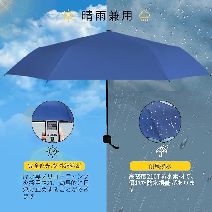 【2025新登場】 日傘 折りたたみ傘 UVカット 遮光 遮熱 晴雨兼用 超軽量 コンパクト 紫外線遮断 日焼け防止 耐風撥水 梅雨対策 携帯便利 収納ポーチ付き メンズ レディース 男女兼用 母の日 父の日 プレゼント (ネイビー)。 【完全遮光&日焼け止め】高密度傘生地と厚い黒ノリコーティングを採用して、UPF50+、UVカット率100%、完全遮光、効果的に日焼け止めすることができます。 真夏の強い日差しを遮り、紫外線からしっかり肌を守り、日焼け防止、熱い日差しの中でも涼しく過ごせます。 ご注意:傘を開く時、ボタンを押さないでください。 両側を握ってください。 【晴雨兼用】この折りたたみ傘は高密度防水素材を採用し、超撥水テフロン加工が施され、通常の折りたたみ日傘よりも優れた防水機能、軽く振るだけで雨が玉のように一気に落ちるので、他の人の邪魔になることもありません。 雨の日も、晴れの日も兼用でご利用頂けます。 【頑丈な6本骨&耐風撥水】センターポールと6本の傘骨は頑丈なアルミニウム合金製で、超軽量の折畳み傘でありながら、耐久性も向上され、風に強くて折れにくい。 梅雨対策や、荒れた天気にも難なく対応できる晴雨兼用の折りたたみ傘です。 【超軽量&携帯便利】この男女兼用折りたたみ日傘はコンパクトのデザインで、折りたたみ時のサイズは18×5×5cm、重量は約230g、とても小さくて軽いです。 バッグに簡単に入れることができ、通学、通勤、遠足、旅行,出張など幅広くご利用できます。 S000-K1010