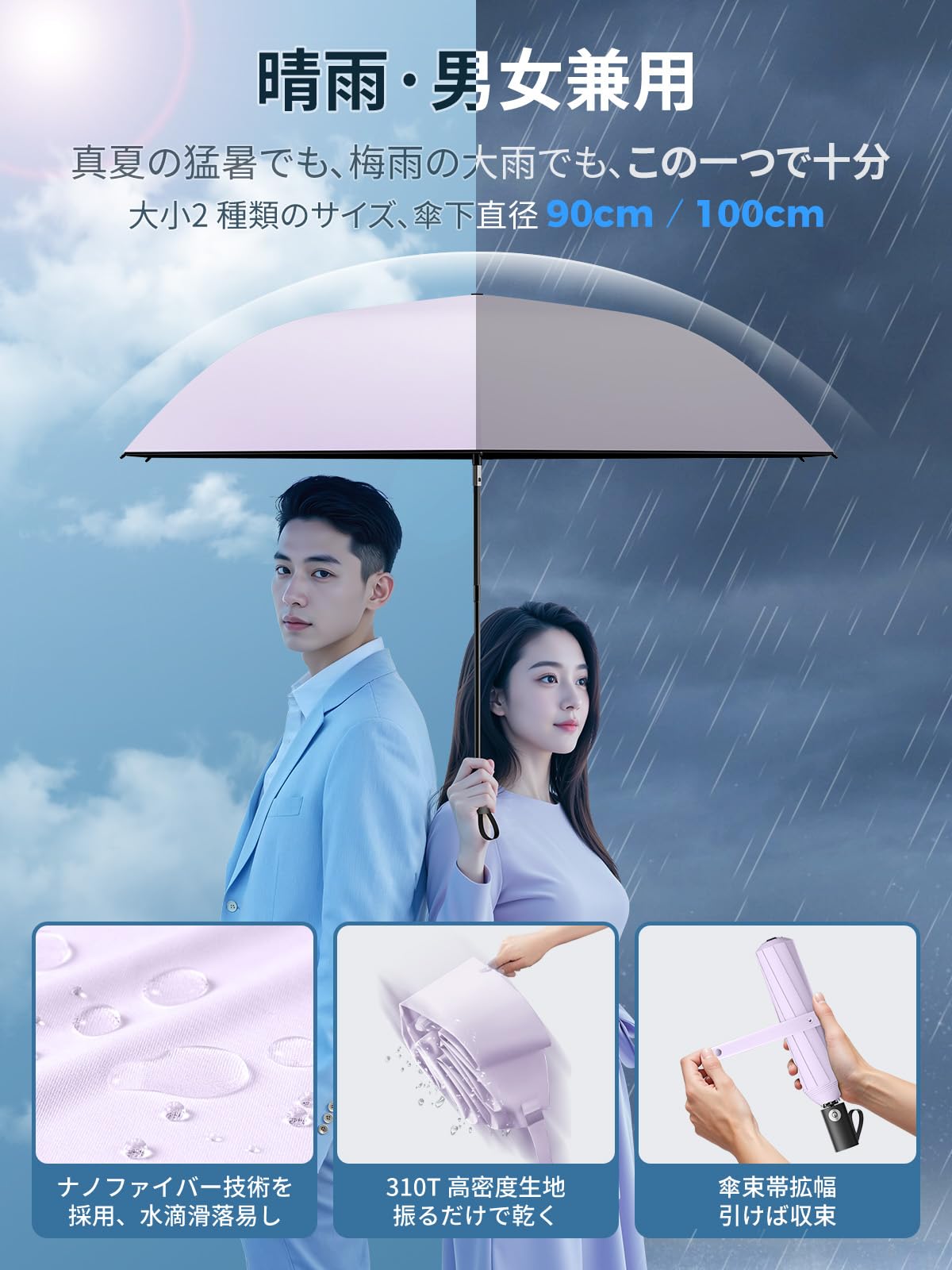 【JIS認証·現役皮膚科医監修】日傘 UVカット100遮光遮熱 折り畳み【業界初!改良型ワンタッチ自動開閉】UPEBおりたたみ傘 188g-230g超軽量 コンパクト 紫外線遮断 折りたたみ傘 耐風撥水 晴雨兼用 携帯便利 日傘メンズ/レディース/ガールズ/ガールズ/子供/大人兼用 収納ポーチ付き 母の日 父の日 お祝い 誕生日プレゼント2年品質保証 (薄紫, 100cm直径超大サイズ)。 【業界初!進化型ワンタッチ自動開閉】新生チーム『日傘』が再び業界を震撼させる!UPEB独自の安全式段階収納自動おりたたみ傘は、反発を防ぎながら段階的に収納し、省力 60% となっており、小学 1 年生のお子様でも簡単に操作できます。 伝統的な自動傘の収納時の面倒さ(地面に叩く方法、切腹式収納、鞘に入れる方式、跳ね返りによる誤傷など)を一掃します!」。 【JIS認証日傘・100%UVカット・100%遮光遮熱】UPEBの折りたたみ日傘は、一般の基準を100倍上回るJISの専門認証を獲得しています。 日本の国家規格、JIS規格1925にてUVカット率100%を実証。 JIS規格1055にて遮光率100%の実証済み!完全遮光の最高級日傘です。 徹底的なUVカット率100%へのこだわり、厳しい暑さや日焼けから肌を効果的に守ります!紫外線A波(肌の深層まで届く)・紫外線B波(肌を赤くする)・紫外線C波、全ての波長の紫外線を100%UVカット!ドイツ「 Radi-Cool 反射冷却」特許技術のアイスシルク素材!開傘瞬間 20℃ダウン!一般黒・銀コーティング傘より涼しさ抜群!『涼しさを持ち歩ける』大人気の折りたたみ日傘です。 【コンパクト・超軽量・晴雨兼用・耐風撥水】おりたたみ日傘フラットなデザインで、バッグに簡単に入れることができます。 折りたたんだ厚さはわずか4cm、長さは25.5cm、重さは約188g、毎日の持ち運びに最適! 通勤・通学、旅行、ハイキング、スポーツなど、あらゆるシーンで幅広く利用でき、老若男女問わず幅広い世代の方々にご利用いただけます!繊維ナノテクノロジーを採用し、310T 高密度の傘生地を使用しています。 雨滴が落下しても丸くなって転がり落ち、長期使用しても染み込みません。 撥水性は抜群で、軽く振ればすぐに乾き、バッグに入れることができます。 航空機級のアルミ合金とグラスファイバー製の傘骨は、錆びにくく、変形しにくく、高強度と柔軟性を兼ね備えています。 安定性と耐久性が大幅に向上しています!。 【大小2 種類のサイズ、傘下直径 90cm/100cm・9 色から選べます】90cm の小サイズは軽量で持ち運びが簡単で、いつでもどこでも風や雨を遮ってくれます。 日常の通勤や買い物の際に、最適なお供となります。 100cm の大サイズは、適切な遮蔽面積で、全方位の保護を提供します。 突然の激しい雨でも、心配することはありません 。 人それぞれユニークな個性とスタイルを持っています。 UPEB が丹念にデザインした 9 色は、服との相性が良いだけでなく、それぞれ鮮明で特徴的です。 傘を差して歩くすべての瞬間に、あなたが独一無二の風景になれます 。 S350-K9999