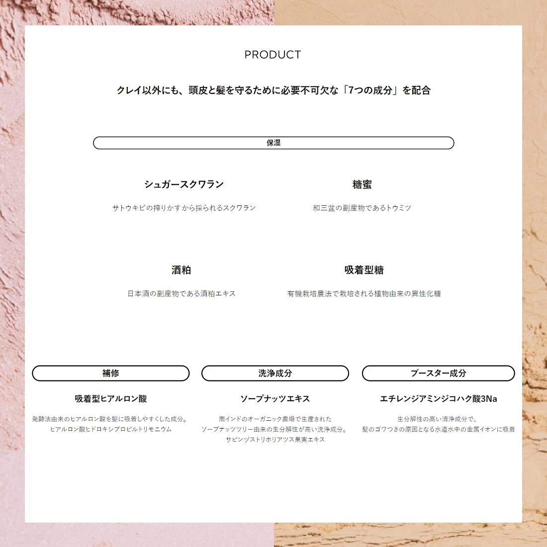 ビーエックス クレイエステ プライミングシャンプー ゴールドクレイ 800ml。 商品紹介 天然のゴールドクレイ※1と、酒粕・糖蜜※2を含む豊かな泡が頭皮環境を整え、指通りよくまとまる質感に導きます。 深呼吸したくなるすっきりとしたヒバの香り。 ※1 カオリン(清浄)フェアトレードメーカーの原料 ※2 酒粕エキス、トウミツ(保湿)日本酒や和三盆の副産物 原材料・成分 水、コカミドプロピルベタイン、オレフィン(C14-16)スルホン酸Na、ラウロイルメチルアラニンNa、コカミドメチルMEA、グリセリン、カオリン、酒粕エキス、トウミツ、異性化糖、ヒアルロン酸ヒドロキシプロピルトリモニウム、サピンヅストリホリアツス果実エキス、エチレンジアミンジコハク酸3Na、塩化Na、ポリクオタニウム-10、クエン酸、デシルグルコシド、PEG-40水添ヒマシ油、PPG-14ポリグリセリル-2エーテル、EDTA-2Na、ラウロイルグルタミン酸ジヘキシルデシル、カラメル、酸化鉄、BG、安息香酸Na、フェノキシエタノール、香料 使用方法 お湯で髪全体をよく濡らし、適量を手のひらに取り、髪全体に伸ばし、頭皮をマッサージするように泡立ててお洗いください。 その後、十分にすすいでください。 安全警告 使用中、または使用した肌に直射日光があたって、赤み、はれ、かゆみ、かぶれ、刺激、色抜け(白斑等)や黒ずみ等の異常が現れた場合は使用を中止し、皮膚科専門医等にご相談ください。 そのまま使用を続けますと、症状を悪化させることがあります。 傷、はれもの、湿疹、皮膚炎(かぶれ、ただれ)等の皮膚障害がある時は、悪化させるおそれがあるので使用しないでください。 目に入らないよう注意し、入った時は直ちに洗い流してください。 極端に低温または高温の場所、直射日光を避け、乳幼児の手の届かない場所に保管してください。 天然のゴールドクレイ※1と、酒粕・糖蜜※2を含む豊かな泡が頭皮環境を整え、指通りよくまとまる質感に導きます。 <br> 深呼吸したくなるすっきりとしたヒバの香り。 <br> ※1 カオリン(清浄)フェアトレードメーカーの原料<br> ※2 酒粕エキス、トウミツ(保湿)日本酒や和三盆の副産物。 S000-K9999