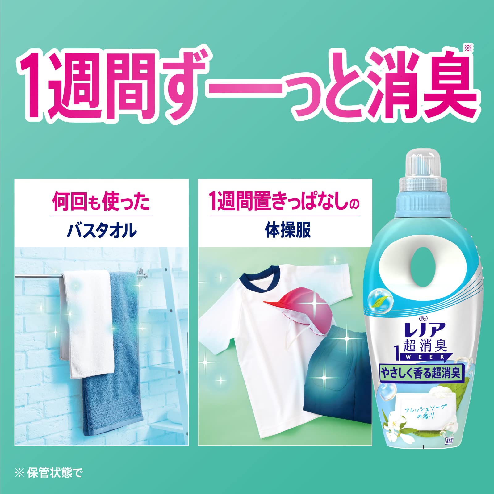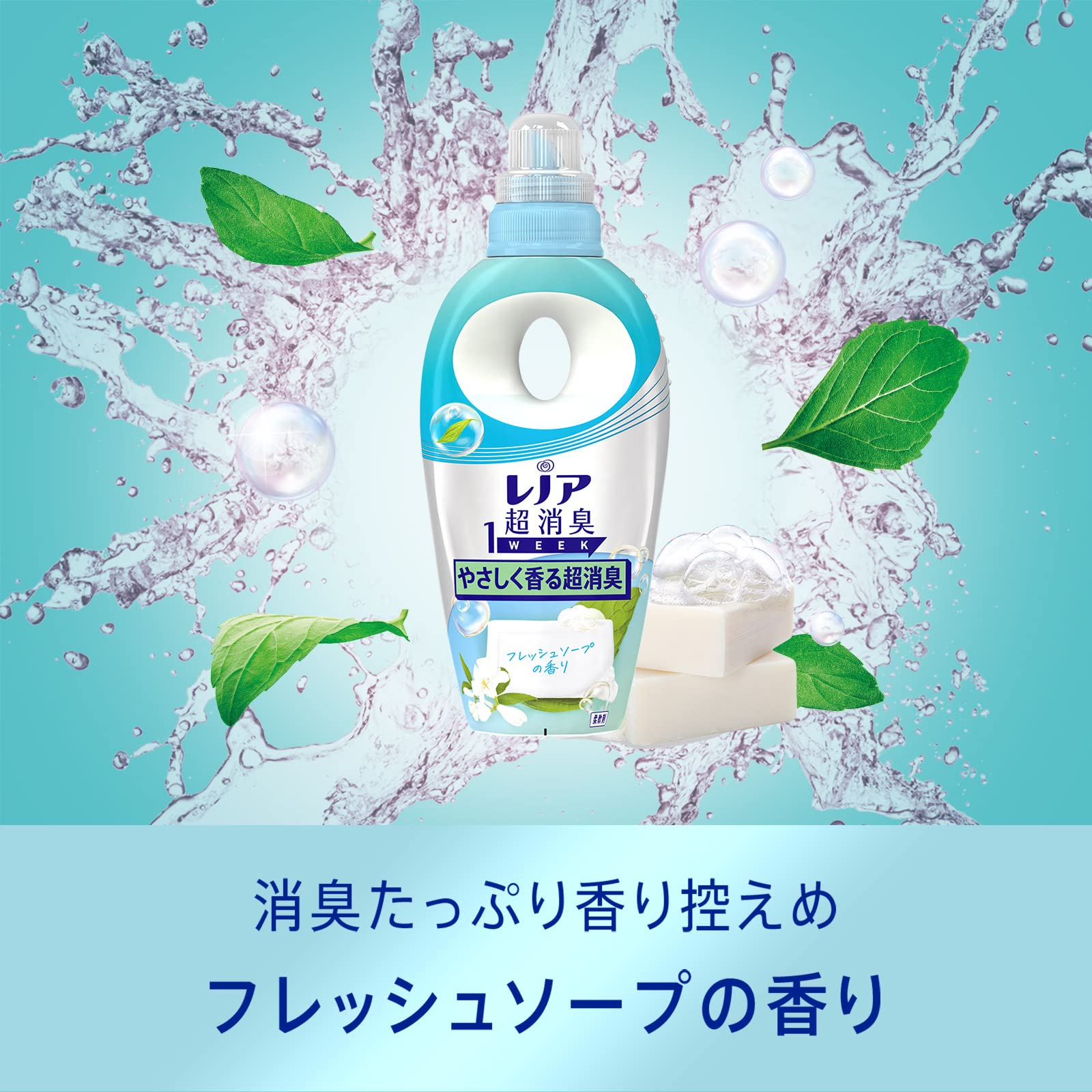レノア 超消臭1week 柔軟剤 フレッシュソープ 詰め替え 大容量 1,900mL。 商品紹介 1週間ずーっと消臭* 1強い香りでごまかさない幅広いニオイ超消臭: スポーツの汗臭、洗濯槽のニオイ、枕カバーの加齢臭、体臭、部屋干しの生乾き臭衣類の花粉ブロック* 2静電気ブロック*1 保管状態で*2 静電気を防ぐ効果による 柔軟剤 原材料・成分 界面活性剤(エステル型ジアルキルアンモニウム塩)、安定化剤、香料。 レノア超消臭1weekは、汗をかいた時のニオイはもちろん、ベタつきまで防げるようになりました(*1)。 汗をかいてもさらっと吸収して速乾(*1)。 しかも、何度汗をかいてもニオイ0へ(*2) *1 自社他柔軟剤と比較。 *2 柔軟剤未使用と比較。 すべてのニオイを0にするわけではありません。 レノア超消臭1WEEKは、80%以上の消費者が実感した、1週間ずーっと続く消臭力(*1)。 かけっぱなしの洗面所のタオルや、ニオイが気になるけれど毎日は洗えない、シーツや枕カバーまで、1週間ずーっと爽やか(*1)。 *1 保管状態で。 レノアの消臭系柔軟剤は、みなさんのお洗濯のニオイ問題やお悩みを解決すべく、無臭化テクノロジーや1週間(*1)ずーっと続く消臭技術など、消臭効果に関する研究を重ねて来ました。 おかげさまで、防臭タイプ柔軟剤の中で売上No.1。 *1 保管状態で。 レノア超消臭なら、夜干しでも速乾(*1)&消臭。 消臭成分が浸透、夜の間にじっくり消臭するから、夜干しなのに、天日干し以上のさわやかさに。 *1 綿のタオルで検証。 選べる6種類の香り。 お求めの消臭力、香りに合わせて、家族で使える6種類の香りをご用意しています。 シトラスの香りは、みずみずしく香るシトラスの香り。 レノアの柔軟剤は、ドラム式洗濯機や自動投入洗濯機でもお使いいただけます。 詳細の使用方法や使用量は、製品裏の説明をご覧ください。 S000-K9999