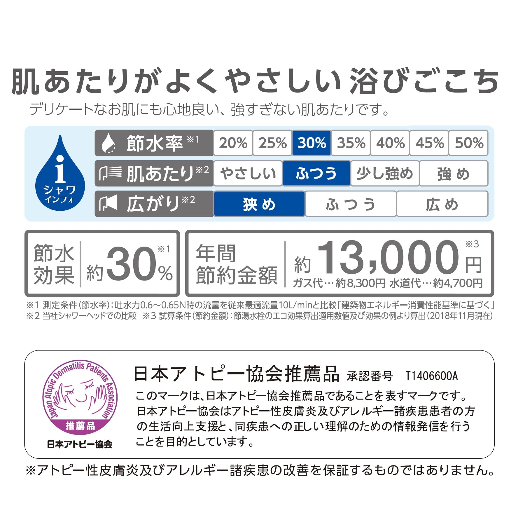SANEI(サンエイ) 浄水シャワーヘッド カートリッジ2本付 残留塩素除去 髪や素肌に優しい 日本アトピー協会推奨品 PS7963-80XAB-MW2。 【浄水効果】素肌や髪の毛に優しい浄水シャワーです。 内蔵されているカートリッジが残留塩素を除去し、皮膚や毛髪への刺激を減らす事ができます。 【日本アトピー協会推薦品】浄水シャワーは、アトピー・アレルギーでお悩みの方々にとって有益であろうという商品として日本アトピー協会推薦品に認定されました。 【軽いシャワーヘッド】薄くて軽いシャワーヘッドなので、握力の弱い方でも、ヘッド部分に指を引っ掛けて保持することが可能です。 【浄水効果】浄水シャワーに使用されている亜硫酸カルシウムは肌の保水力、保湿機能の悪化・肌荒れ・乾燥肌・枝毛・切れげ・かゆみの原因となることもある水道水中の残留塩素を除去します。 残留塩素がたんぱく質を酸化させるため、たんぱく質からなる毛小皮(キューティクル)を傷め、皮膚のたんぱく質も酸化、分解されます。 残留塩素を除去する事で皮膚や毛髪への刺激を減らす事ができます。 【カートリッジ】交換時期の目安:1人→約2ヶ月。 遊離残留塩素低減能力:約4000L ※1日1人あたり8分間使用した場合 交換用カートリッジ品番:PM7163-1B(1本)、PM7163-3BS(3本セット)。 取替えるだけで約30%の節水効果。 年間節約金額約13000円(ガス代約8300円+水道代約4700円)。 取付ネジサイズG1/2。 そのまま取付けできない場合、付属のアダプターをお試しください。 ほとんどのメーカーに対応。 日本製。 S000-K9999