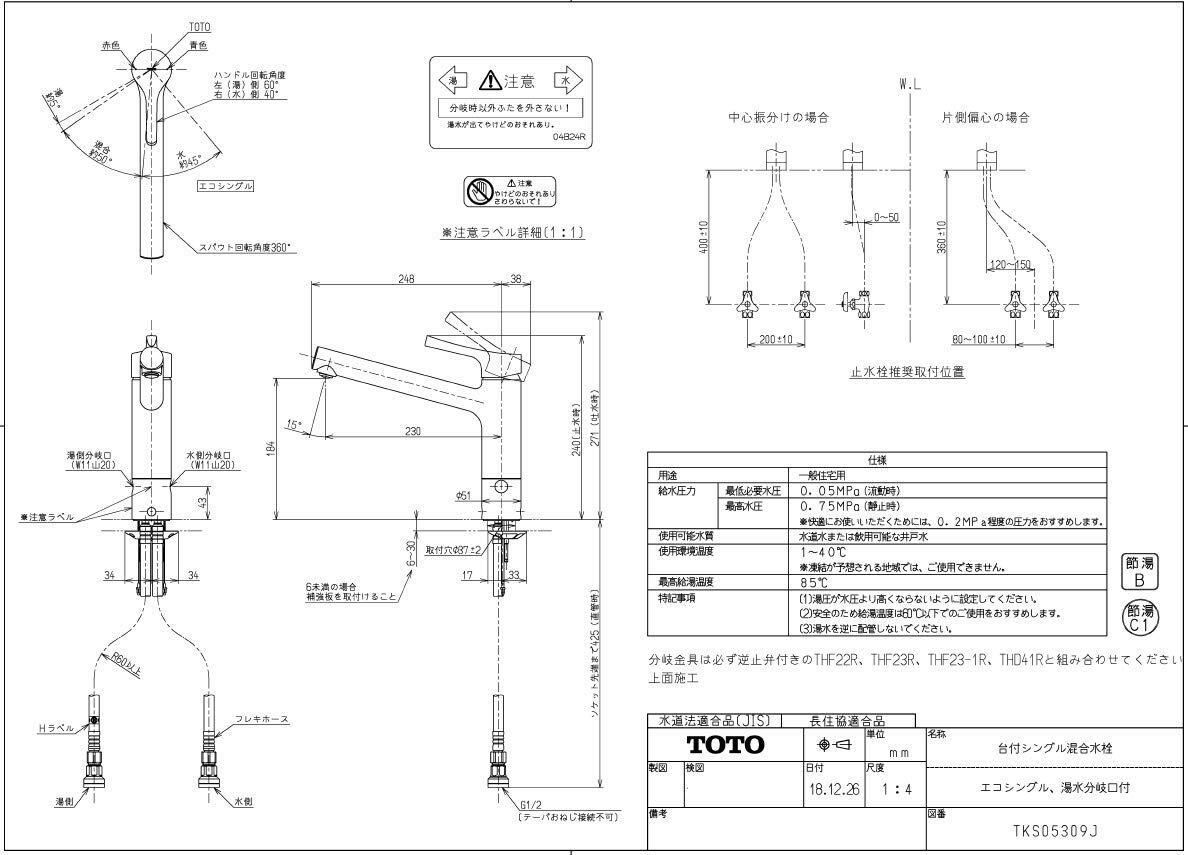 TOTO キッチン水栓 TKS05309J。 TOTO キッチン水栓 TKS05309J。 お掃除しやすいスッキリデザイン:継ぎ目を減らし汚れのふき取りやすさに配慮したゆるやかなカーブのデザイン。 左側に湯、右側に水の分岐口付(保護キャップ付き)※分岐金具は別途購入が必要。 節水節湯性能:節水節湯性能:節湯C1・節湯B。 取付形状:台付1穴,取付穴径mm:37φ±2。 この製品は、旧製品TKGG31EWの後継製品に相当します。 S000-K9999