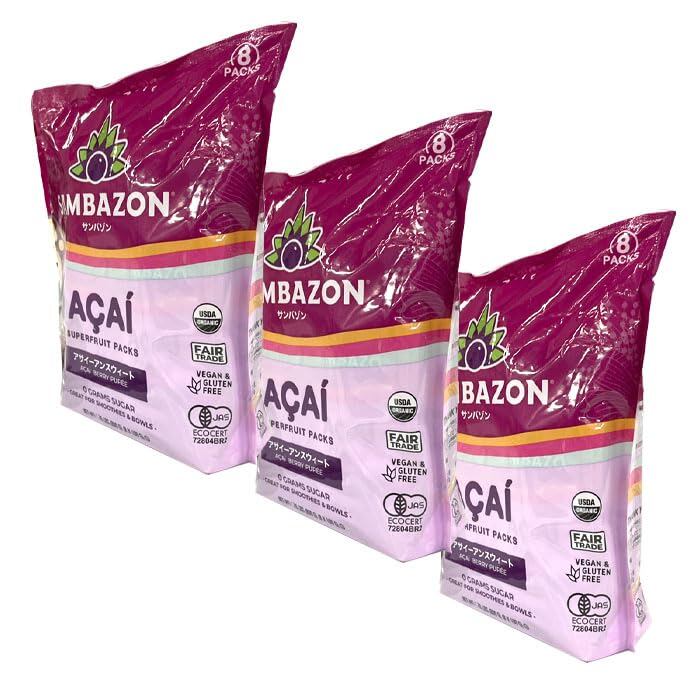 SAMBAZON(サンバゾン) 無糖 アサイースムージーパック (100gx4袋)x3ユニット。 のスーパーフルーツ「有機アサイー」の豊富な栄養素が含まれている果肉と果皮のみを使用して濃厚なアサイーパルプ(ピュレ)を作り、そのまま冷凍にしました。 アンスウィートはこのアサイーパルプにいっさい何も加えない無糖タイプ。 【名称】 有機アサイー(冷凍品)。 【原材料】 有機アサイー/レシチン(ひまわり由来)、クエン酸。 【内容量】 100gx4袋/3ユニット(13袋)。 【使用方法】バナナ、ヨーグルト、ジュースや豆乳などをミキサーで混ぜるだけで、アサイースムージーの出来上がり!。 S000-K1010