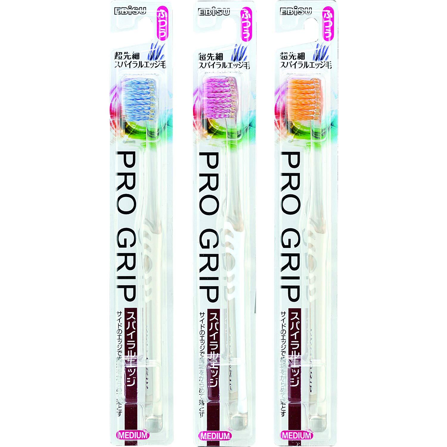 エビス プログリップ スパイラルエッジハブラシ ふつう 3本組 色おまかせ。 六角形の毛にねじりを加えることで、毛の側面に無数のエッジを作り上げた先細スパイラル毛を採用。 らせん状のスパイラルエッジ毛が歯面の歯垢を効果的にからめて落とします。 超先細毛&フラット毛の2種類の毛先。 超先細毛が歯周ポケットに入り込んで汚れをかき出し、フラット毛が歯の表面の歯垢を落とします。 商品サイズ (幅×奥行×高さ) :99×19×230。 原産国:日本。 内容量:3本。 材質:本体部:飽和ポリエステル樹脂、ラバー部:TPEE、SEBS、毛:飽和ポリエステル樹脂。 S000-K9999
